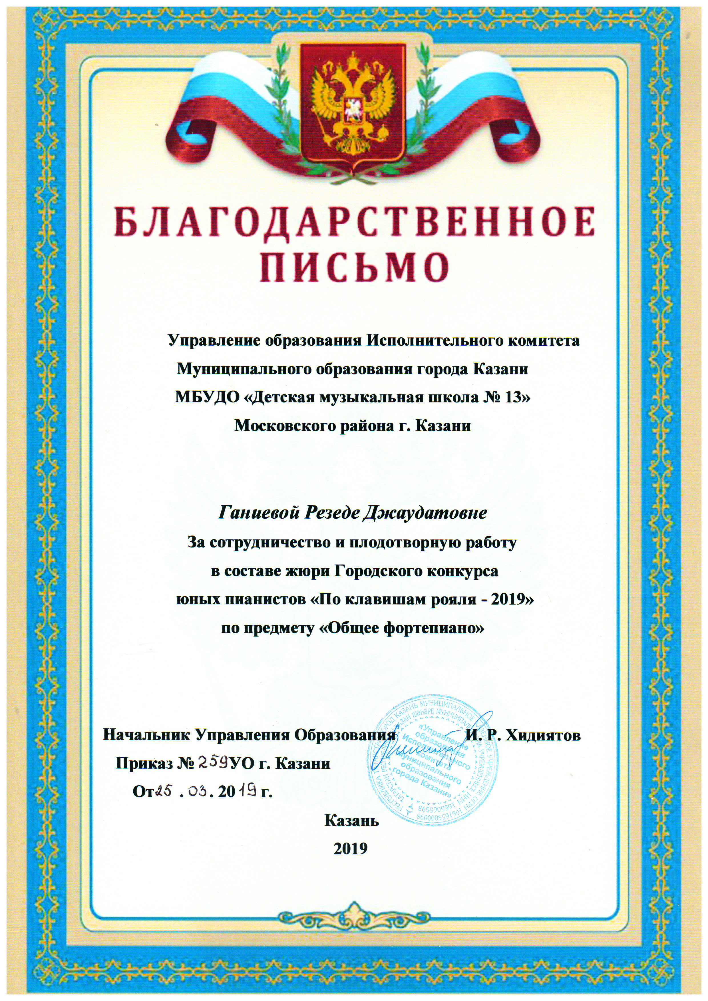 Управление образования ИКМО г.Казани - Благодарственное письмо Гениевой Р.Д. за работу в жюри Городского конкурса "По клавишам рояля";