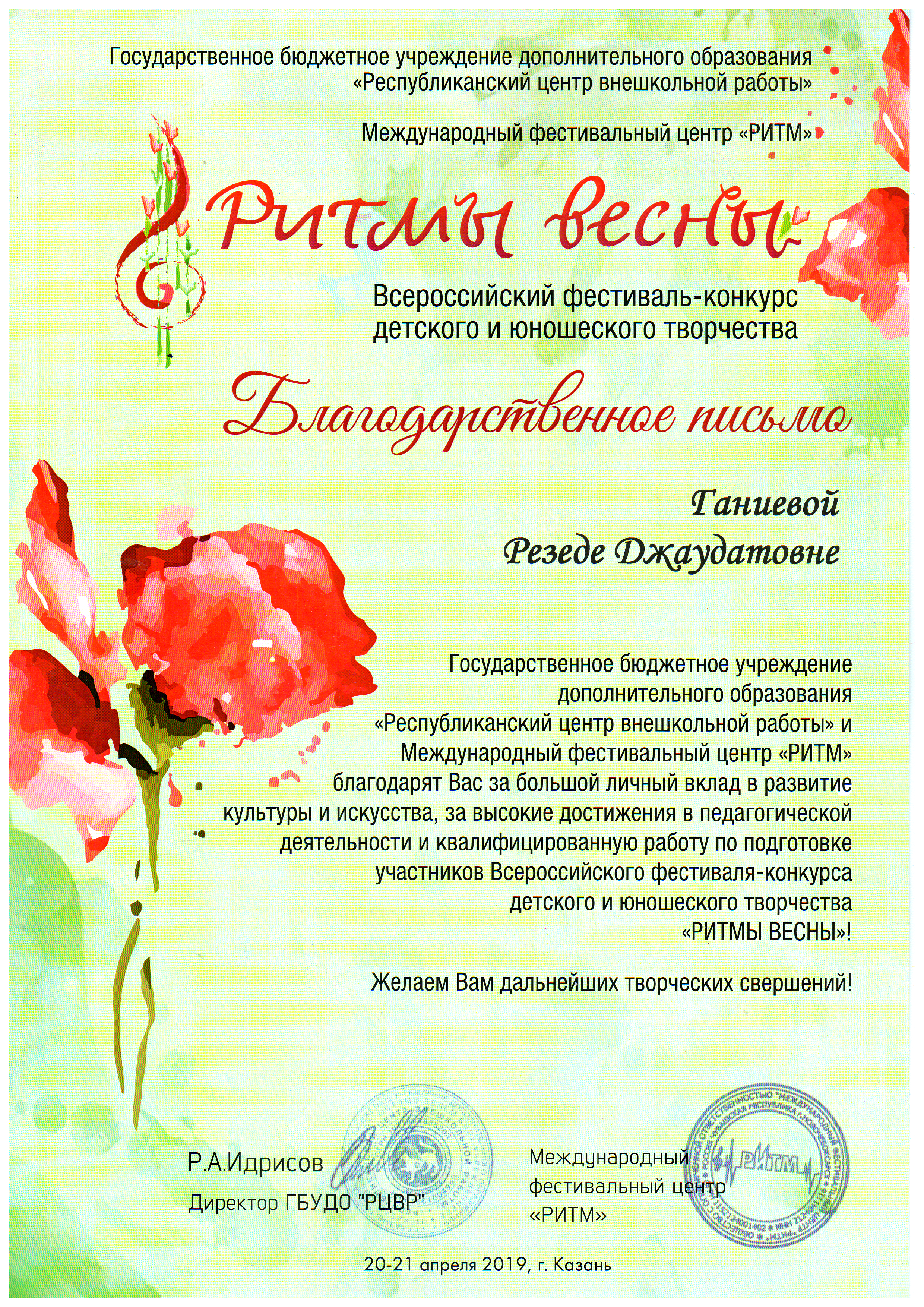 Всероссийский фестиваль-конкурс детского и юношеского творчества "Ритмы весны" - Благодарственное письмо Ганиевой Р.Д.;