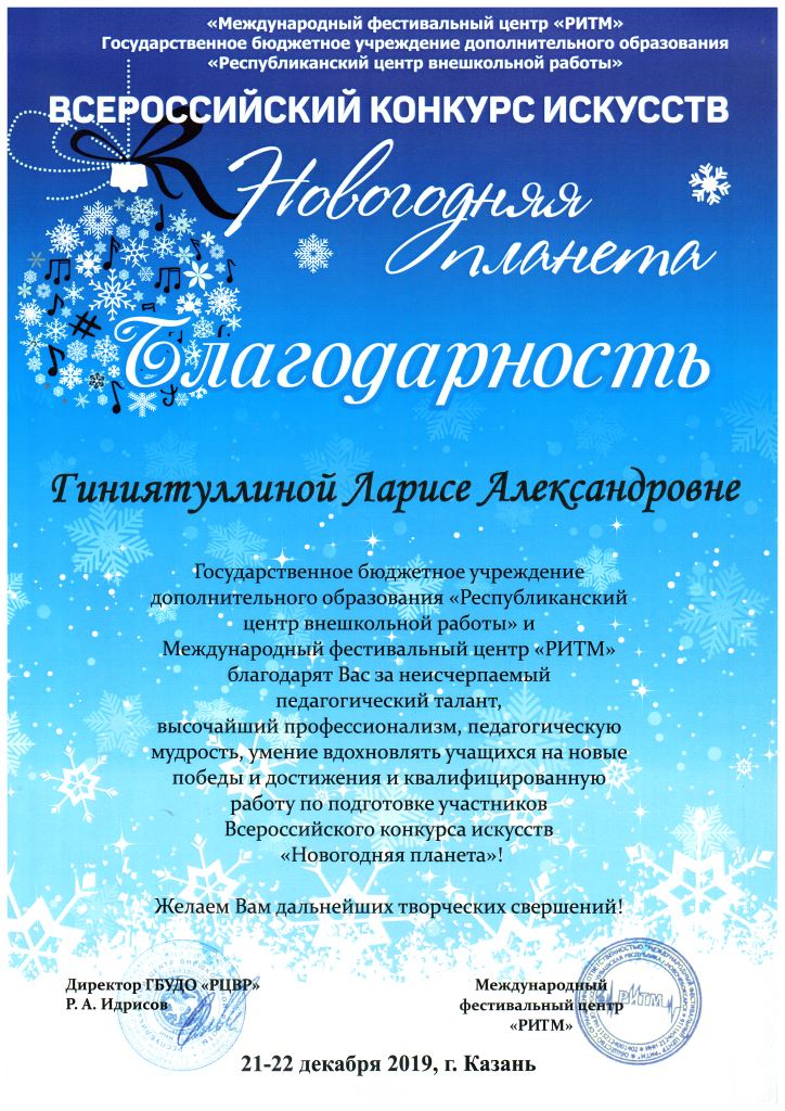 Всероссийский конкурс искусств "Новогодняя планета" - Благодарность Гиниятуллиной Л.А.;