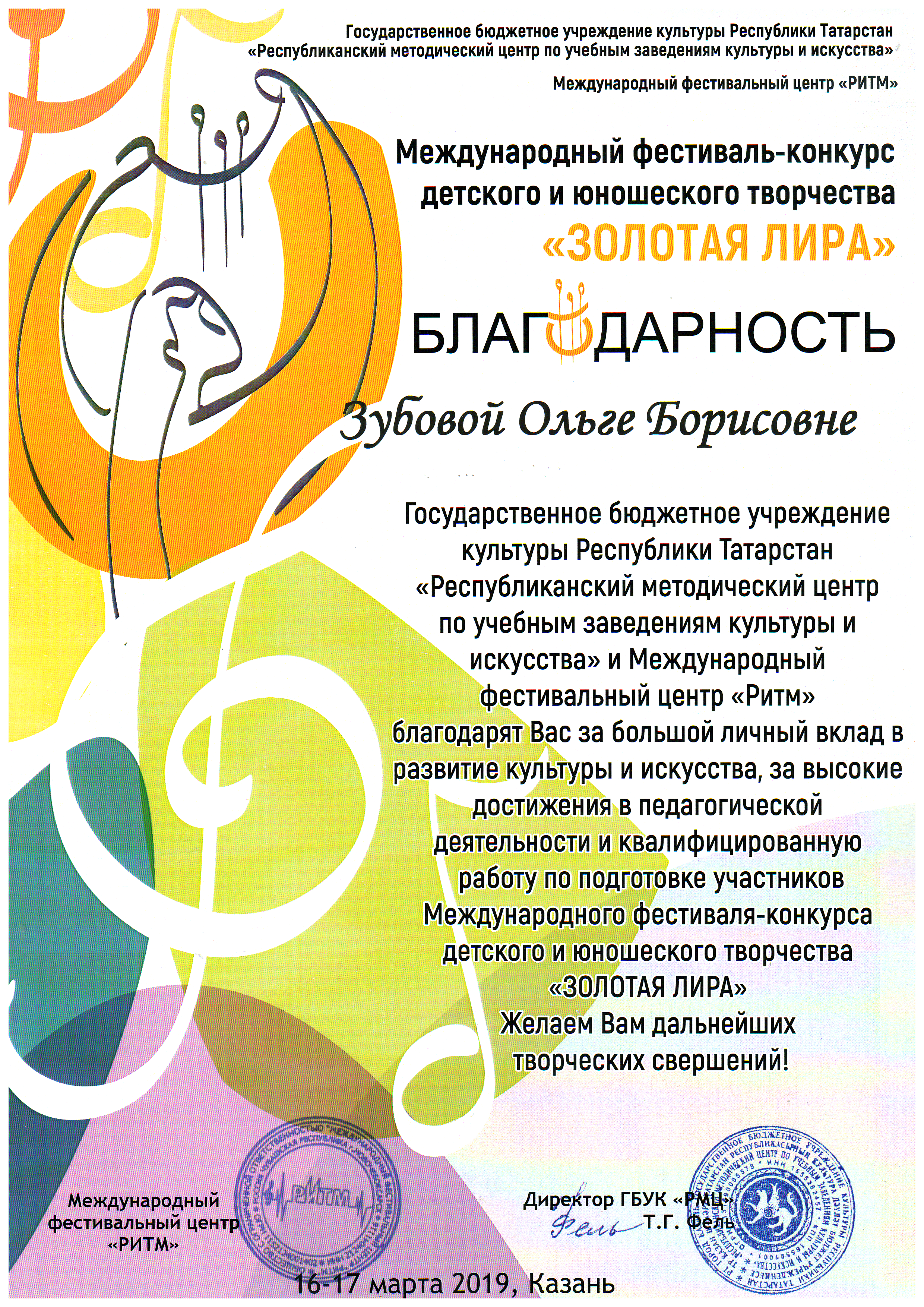 Международный фестиваль-конкурс детского и юношеского творчества "Золотая лира" - Зубова О.Б., Благодарность;