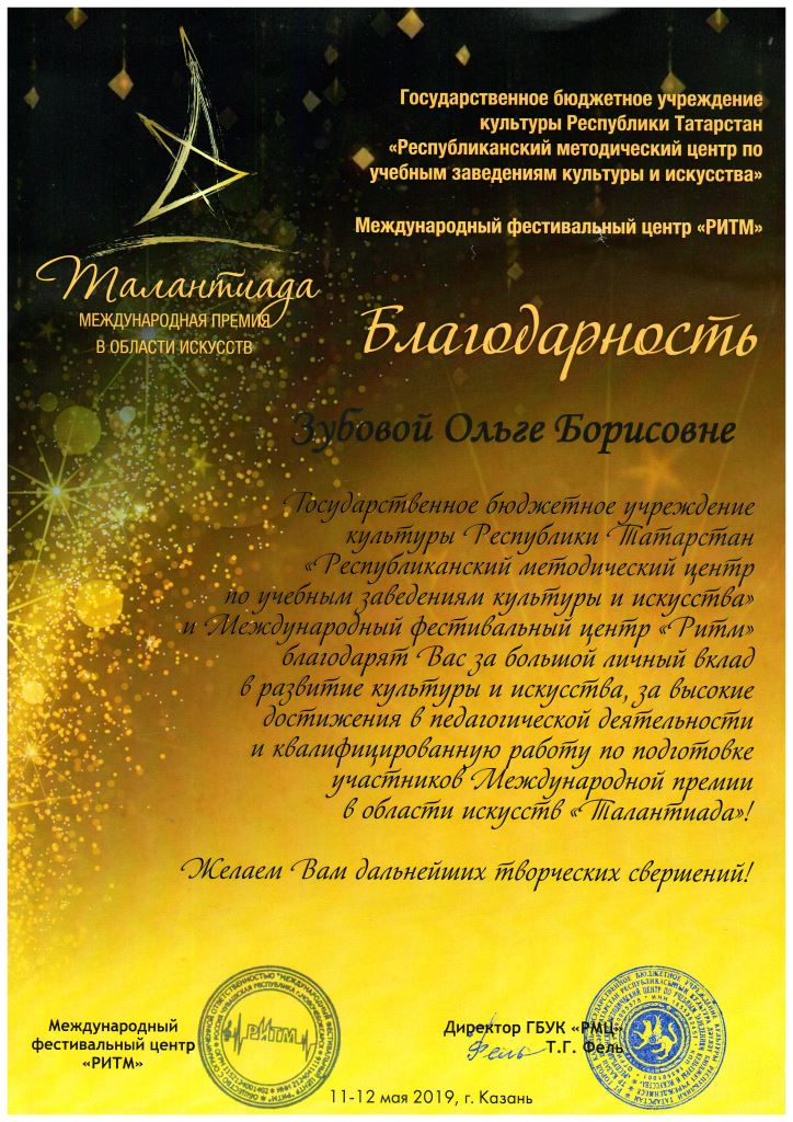 Международная премия в области искусств "Талантиада" - Благодарность Зубовой О.Б.;