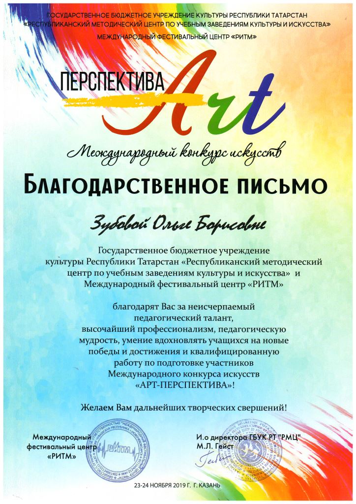 Международный конкурс искусств " Art перспектива" - Благодарственное письмо Зубовой О.Б.;