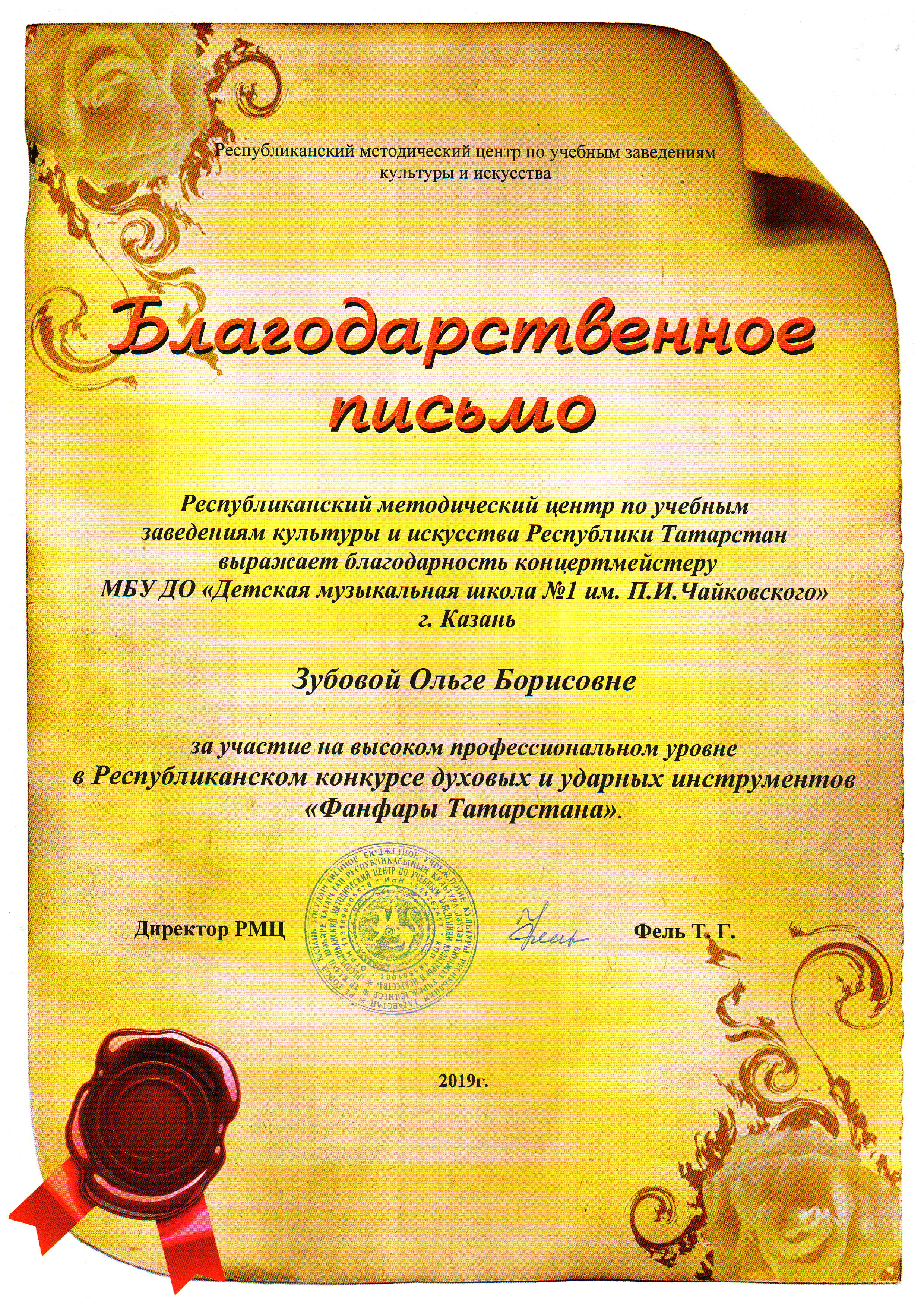 РМЦ МК РТ - Благодарственное письмо Зубовой О.Б. за участие на высоком профессиональном уровне в Республиканском конкурсе испонителей на духовых и ударных инструментах "Фанфары Татарстана";