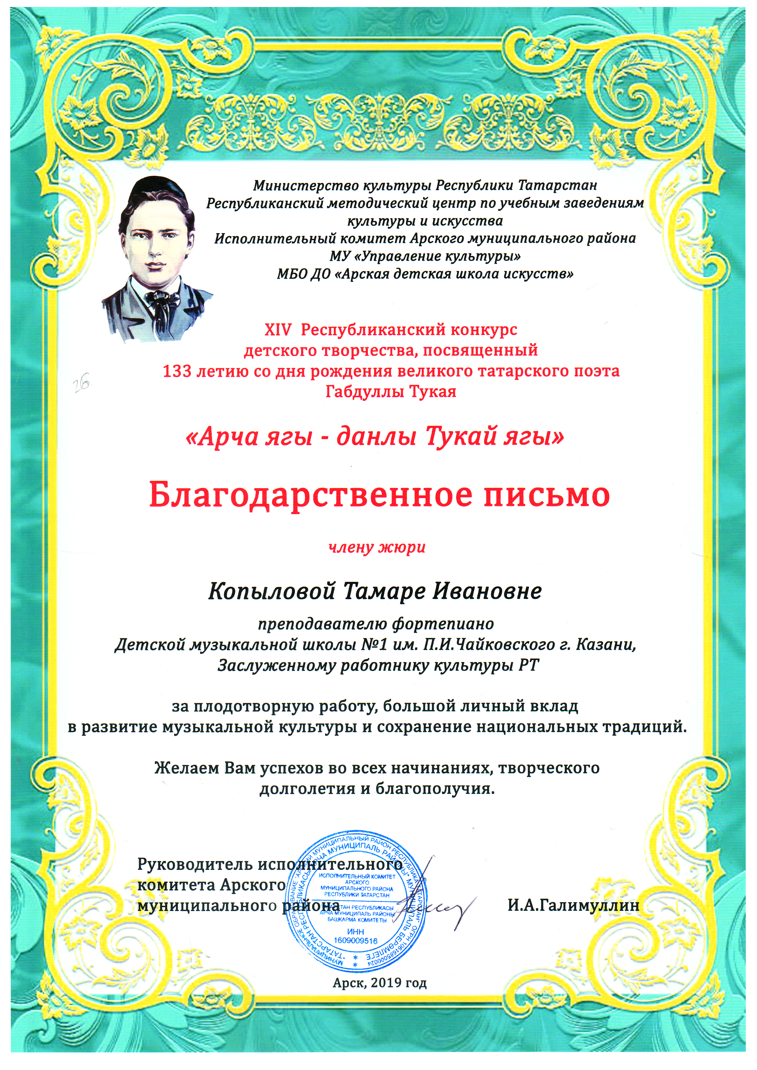 Исполком Арского муниципального района - Благодарственное письмо Копыловой Т.И. за работу в жюри Республиканского конкурса "Арча ягы, данлы тукай ягы";