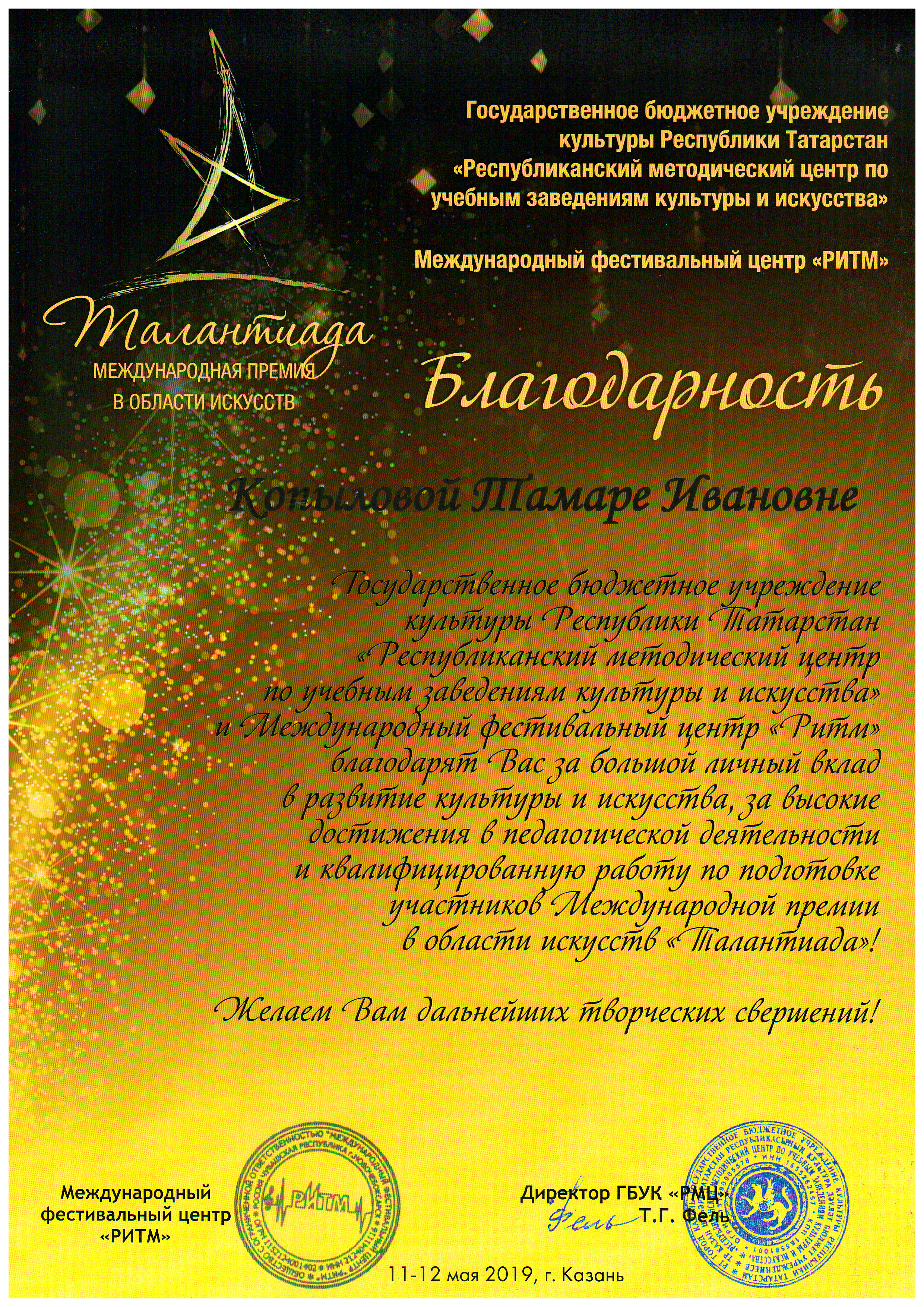 Международная премия в области искусств "Талантиада" - Благодарность Копыловой Т.И.;