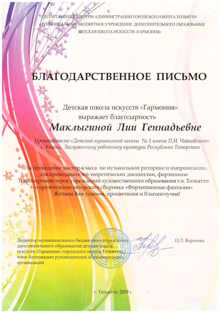 Детская школа искусств "Гармония", г.Тольятти - Благодарственное письмо Маклыгиной Л.Г.;