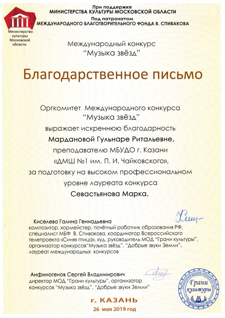 Международный конкурс "Музыка звёзд" - Благодарственное письмо Мардановой Г.Р.;