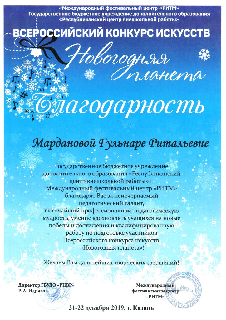 Всероссийский конкурс искусств "Новогодняя планета" - Благодарность Мардановой Г.Р.;