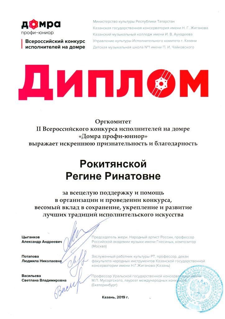 II Всероссийский конкурс исполнителей на домре "Домра профи-юниор" - Благодарность Рокитянской Р.Р.;