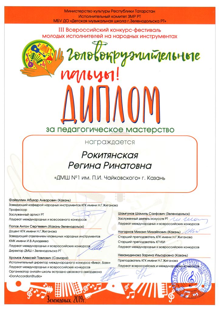 III Всероссийский конкурс-фестиваль молодых исполнителей на народных инструментах "Головокружительные пальцы" - Диплом Рокитянской Р.Р.;