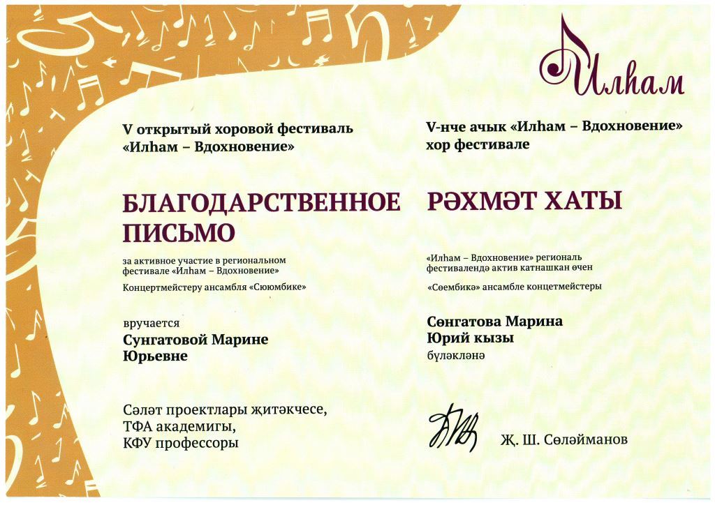 V Открытый региональный хоровой фестиваль"Илhам - Вдохновение" - Благодарственное письмо, Сунгатова М.Ю.;