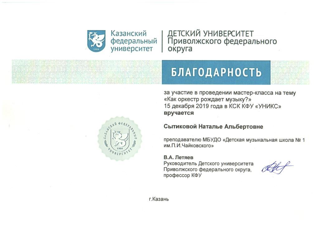 Детский университет ПФО (КСК КФУ "УНИКС") - Благодарность Сытиковой Н.А.;