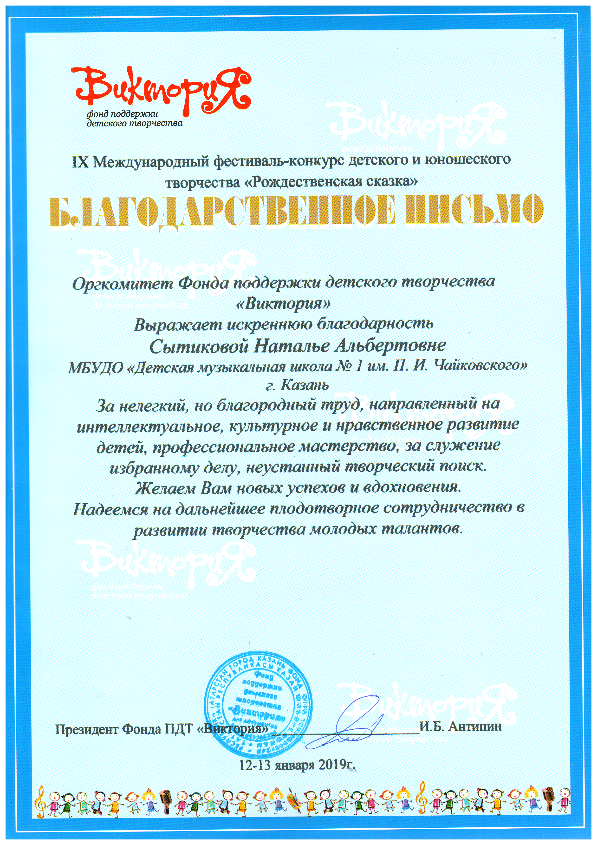 IX Международный фестиваль-конкурс детского и юношеского творчества "Рождественская сказка" - Сытикова Н.А., Благодарственное письмо;