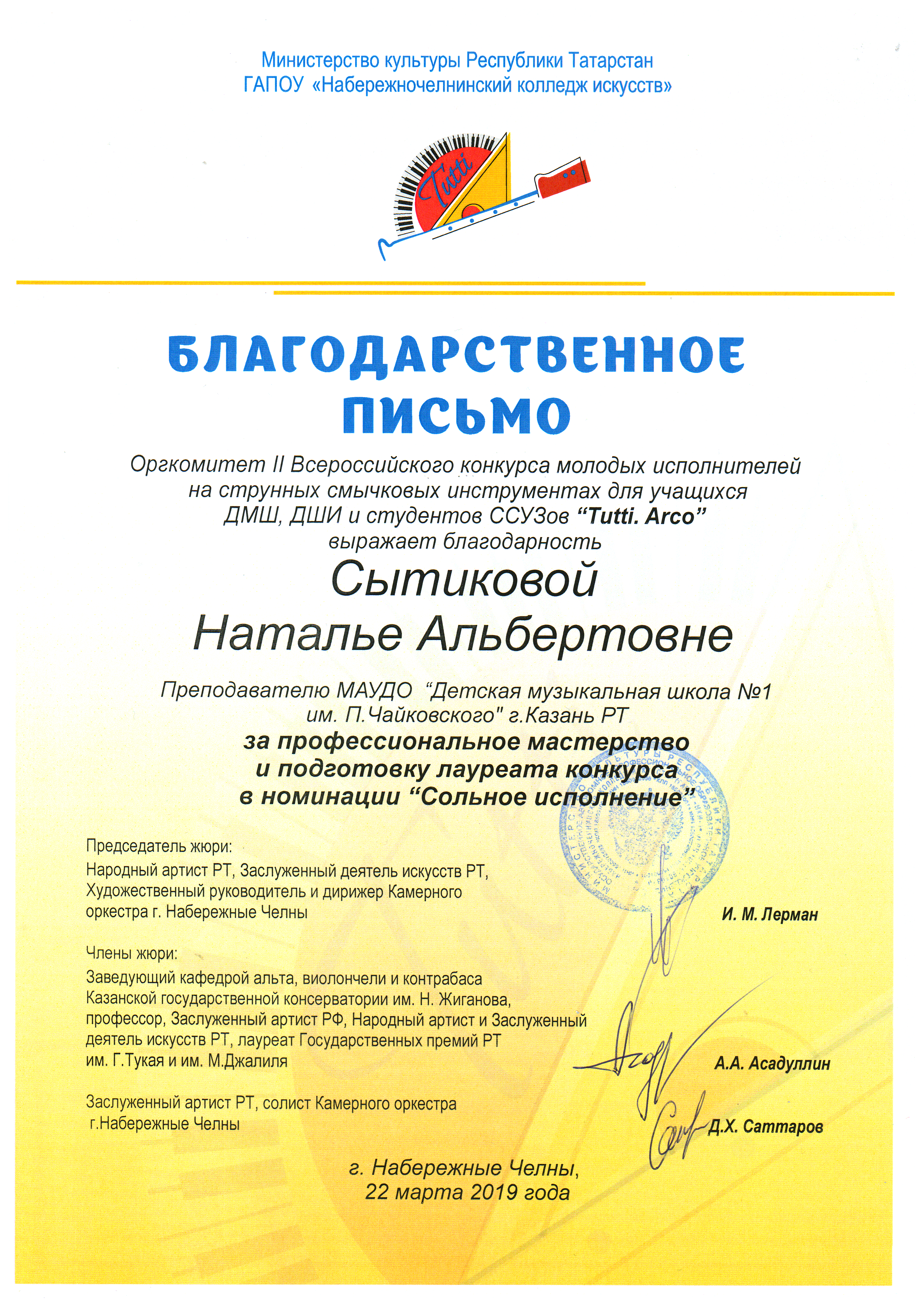 II Всероссийский конкурс молодых исполнителей на струнных смычковых инструментах "TUTTI.ARCO" - Сытикова Н.А., Благодарственное письмо;