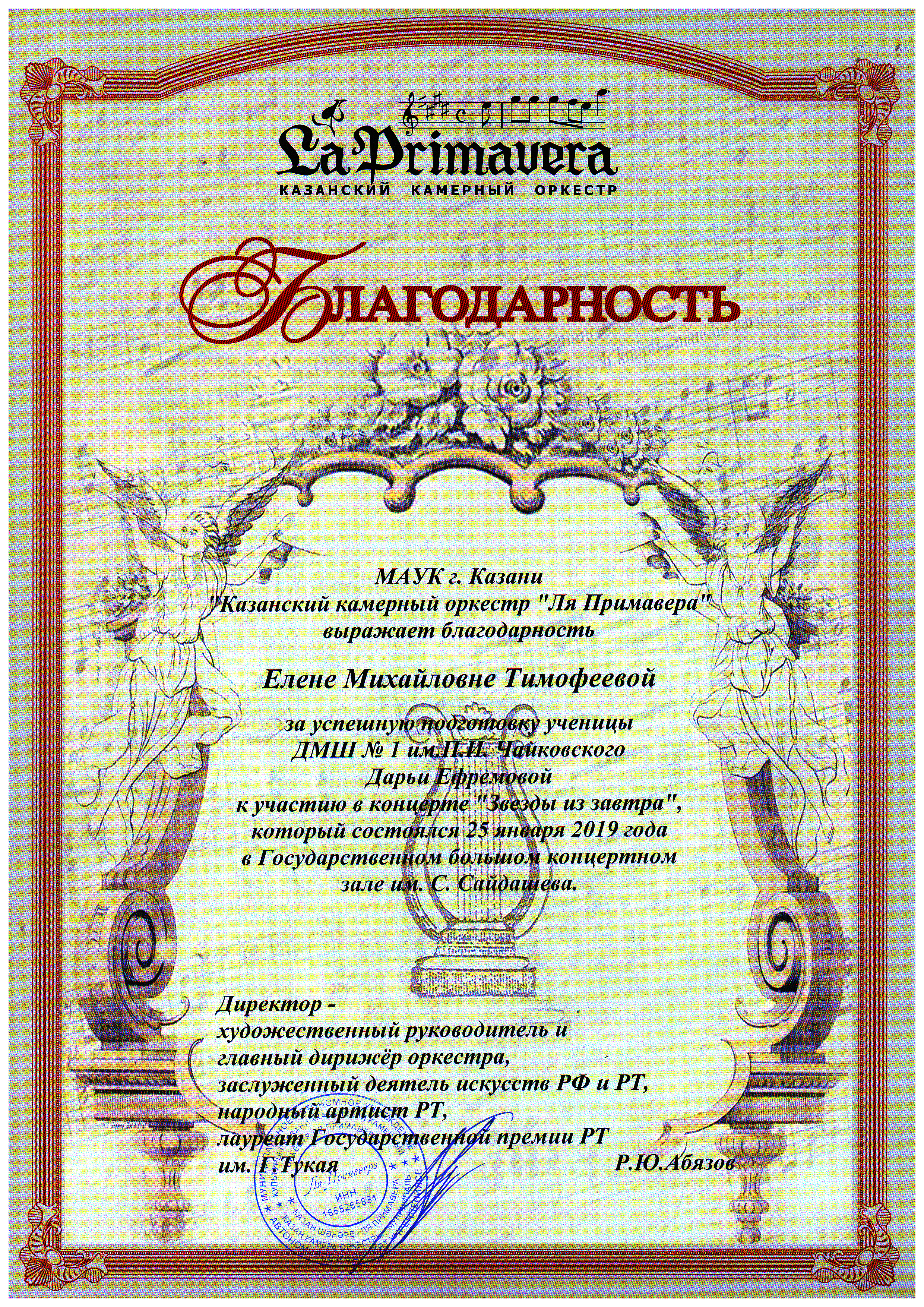 Концерт Казанского камерного оркестра "La Primavera" - Тимофеева Е.М., Благодарность;