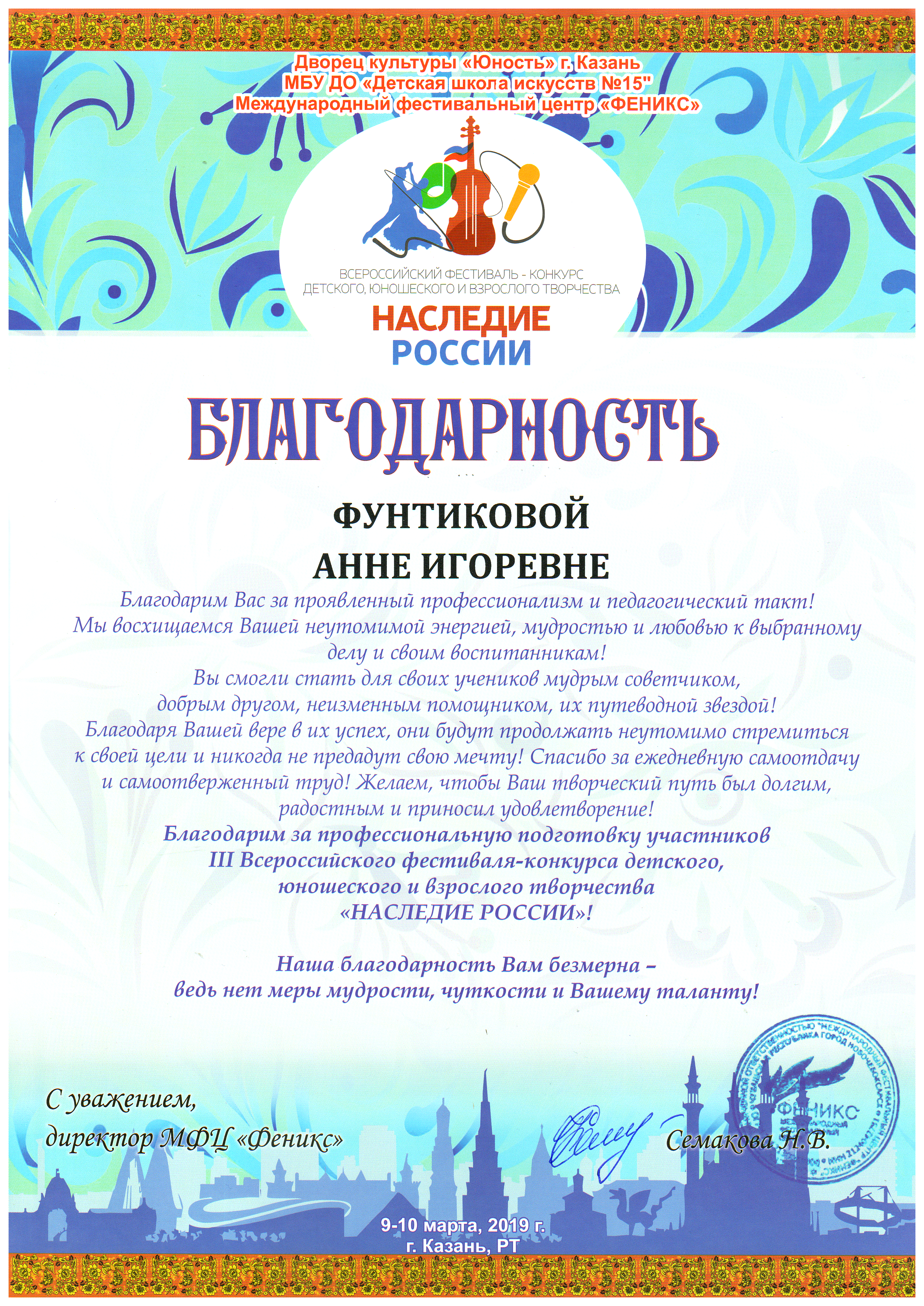 Всероссийский фестиваль детского, юношеского и взрослого творчества "Наследие России" - Фунтикова А.И., Благодарность;