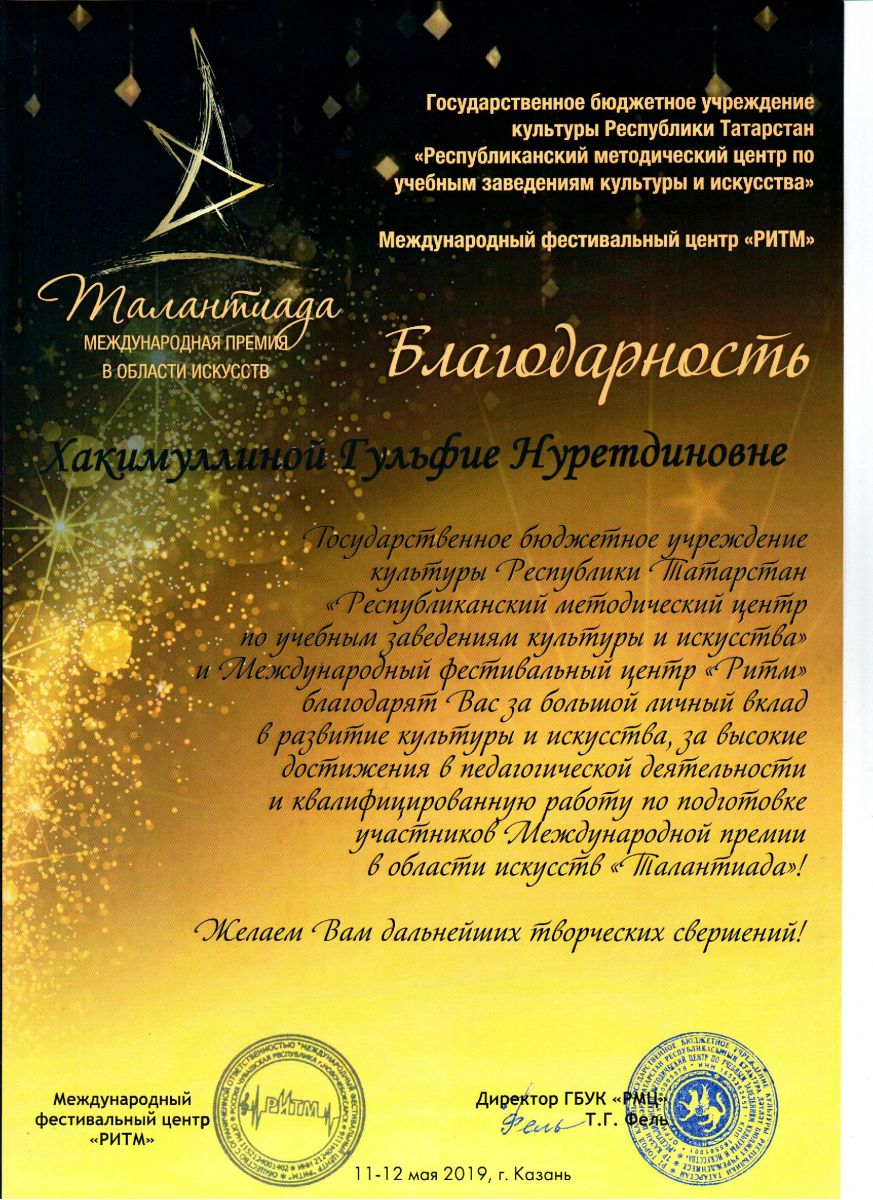 Международная премия в области искусств "Талантиада" - Благодарность Хакимуллиной Г.Н.;