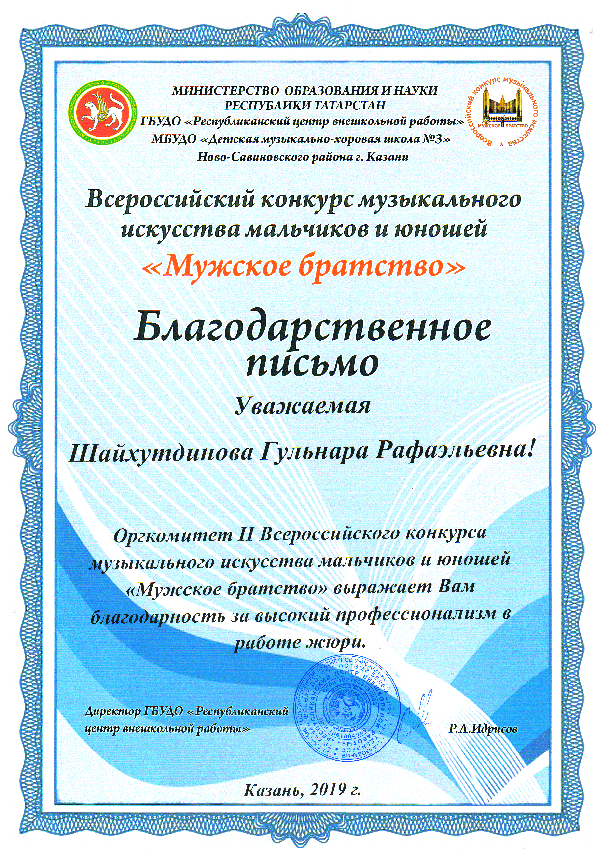 Всероссийский конкурс музыкального искусства мальчиков и юношей "Мужское братство" - Шайхутдинова Г.Р., Благодарственное письмо за работу в составе жюри;