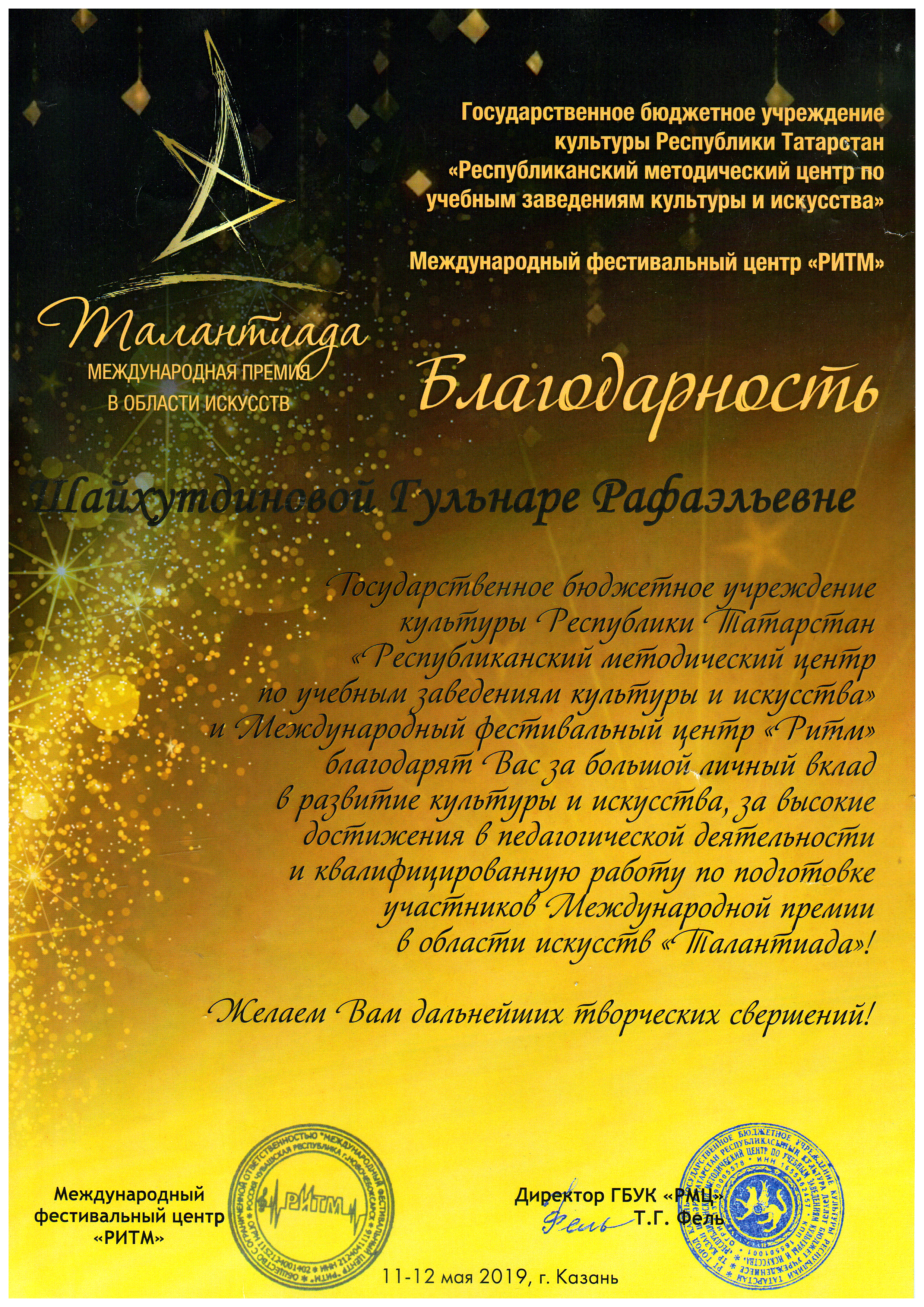 Международная премия в области искусств "Талантиада" - Благодарность Шайхутдиновой Г.Р.;