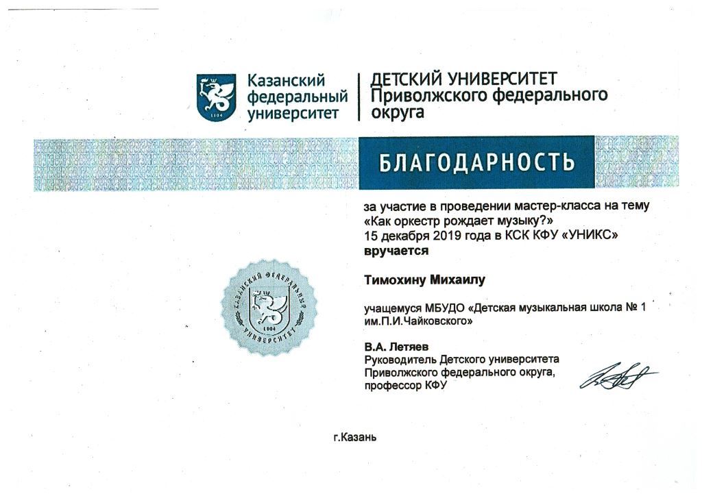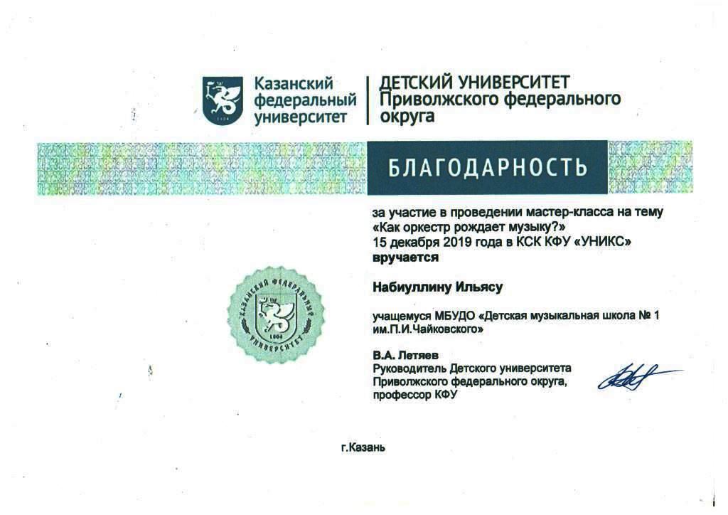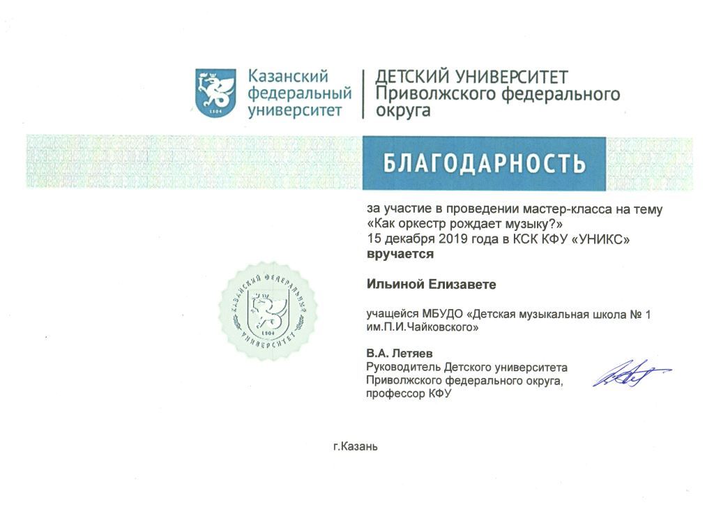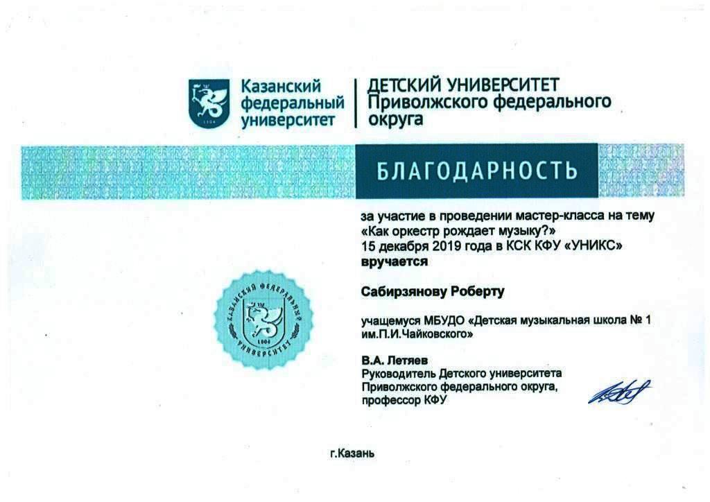 Детский Университет Приволжского федерального округа - Благодарность за участие в проведении мастер-класса "Как оркестр рождает музыку" -