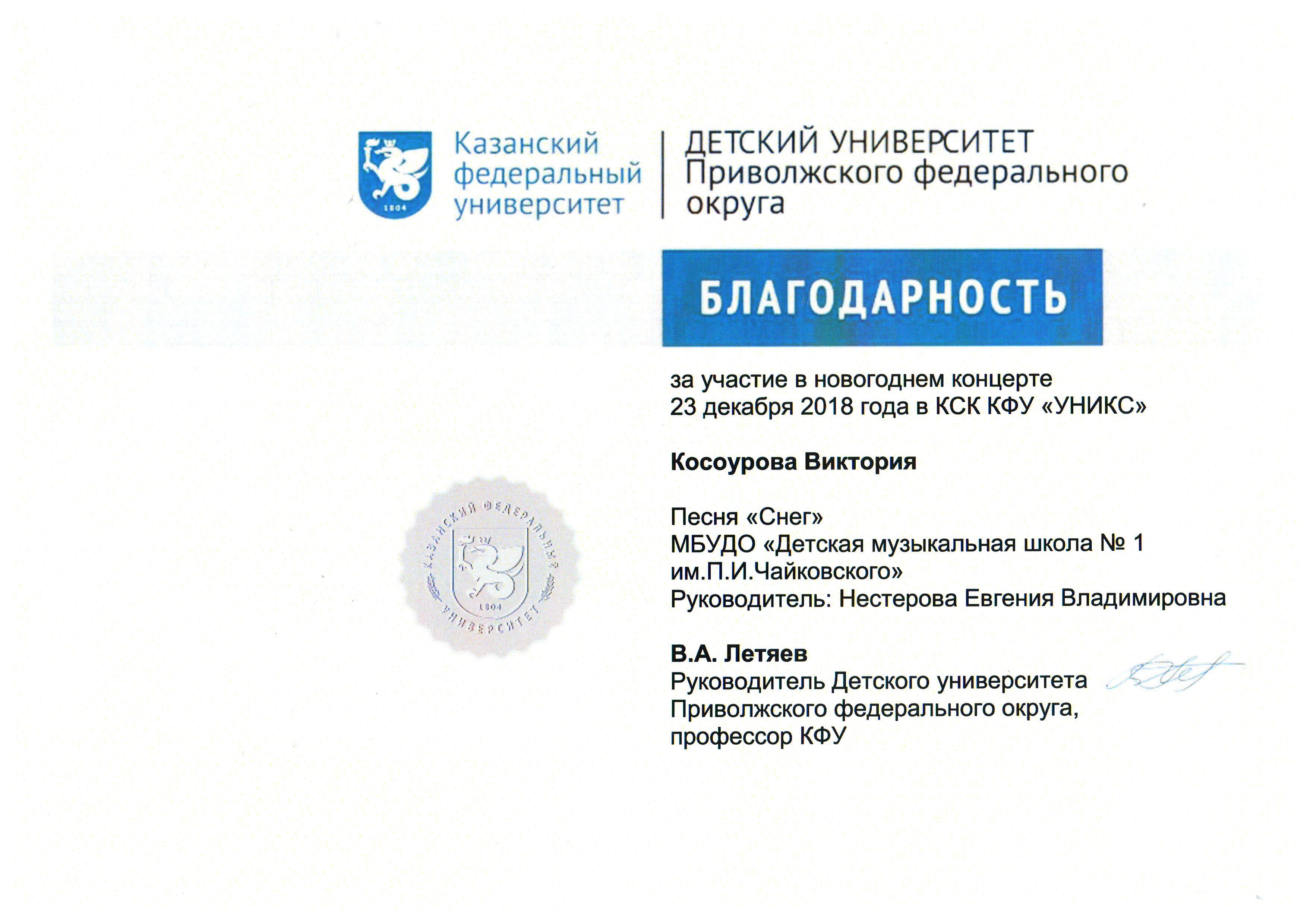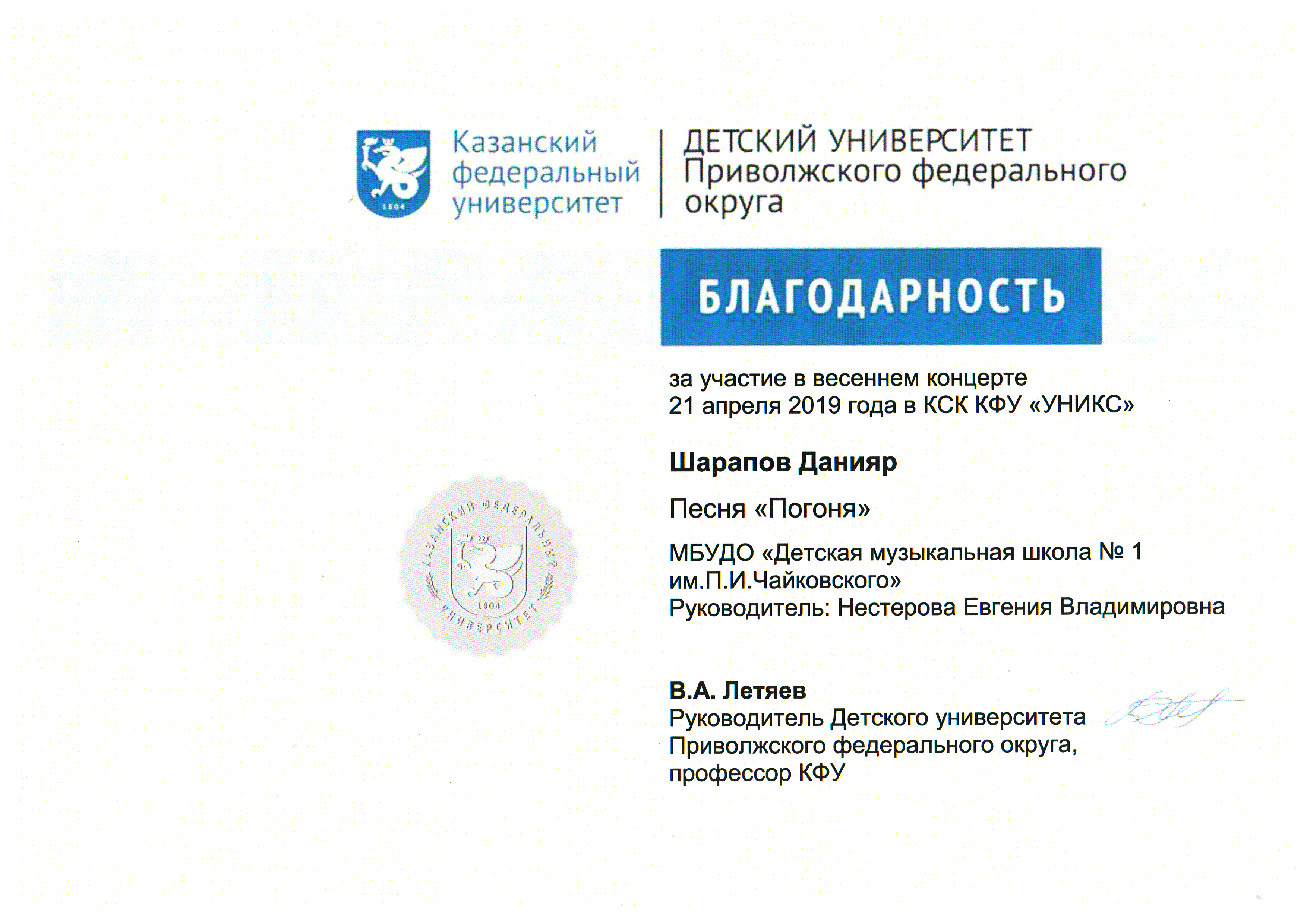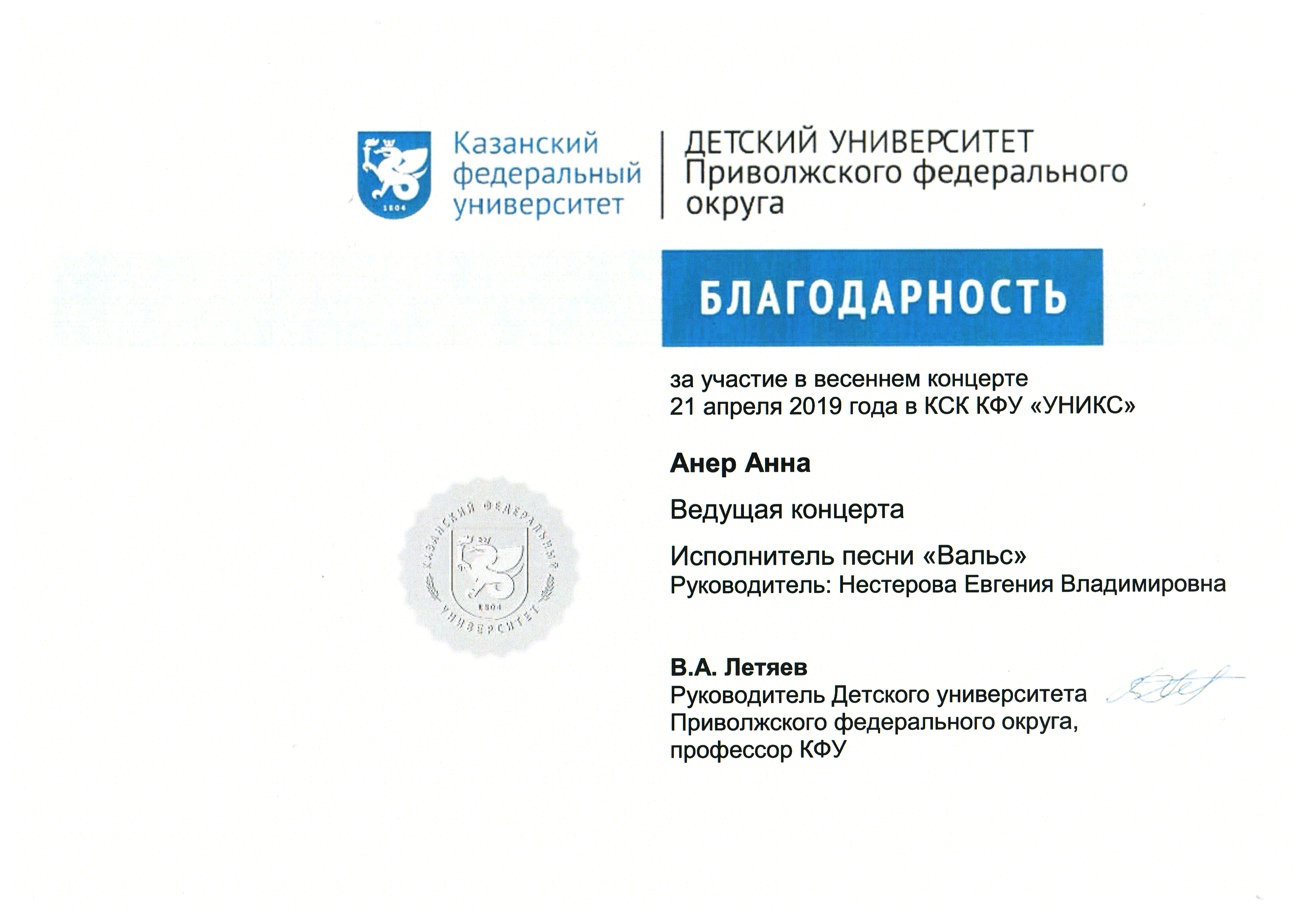 Детский Университет Приволжского федерального округа - Благодарность за участие в проведении мастер-класса "Как оркестр рождает музыку" -