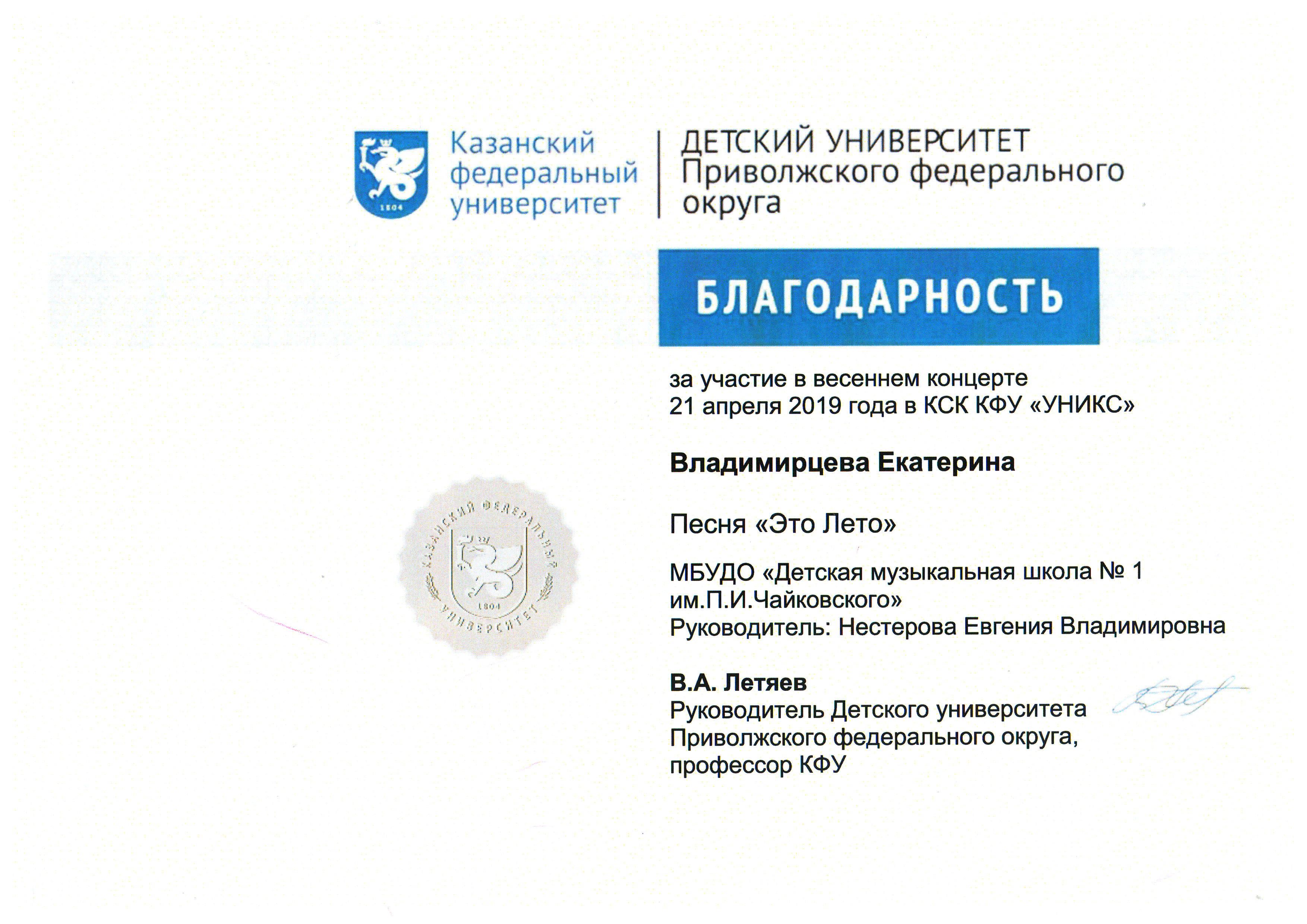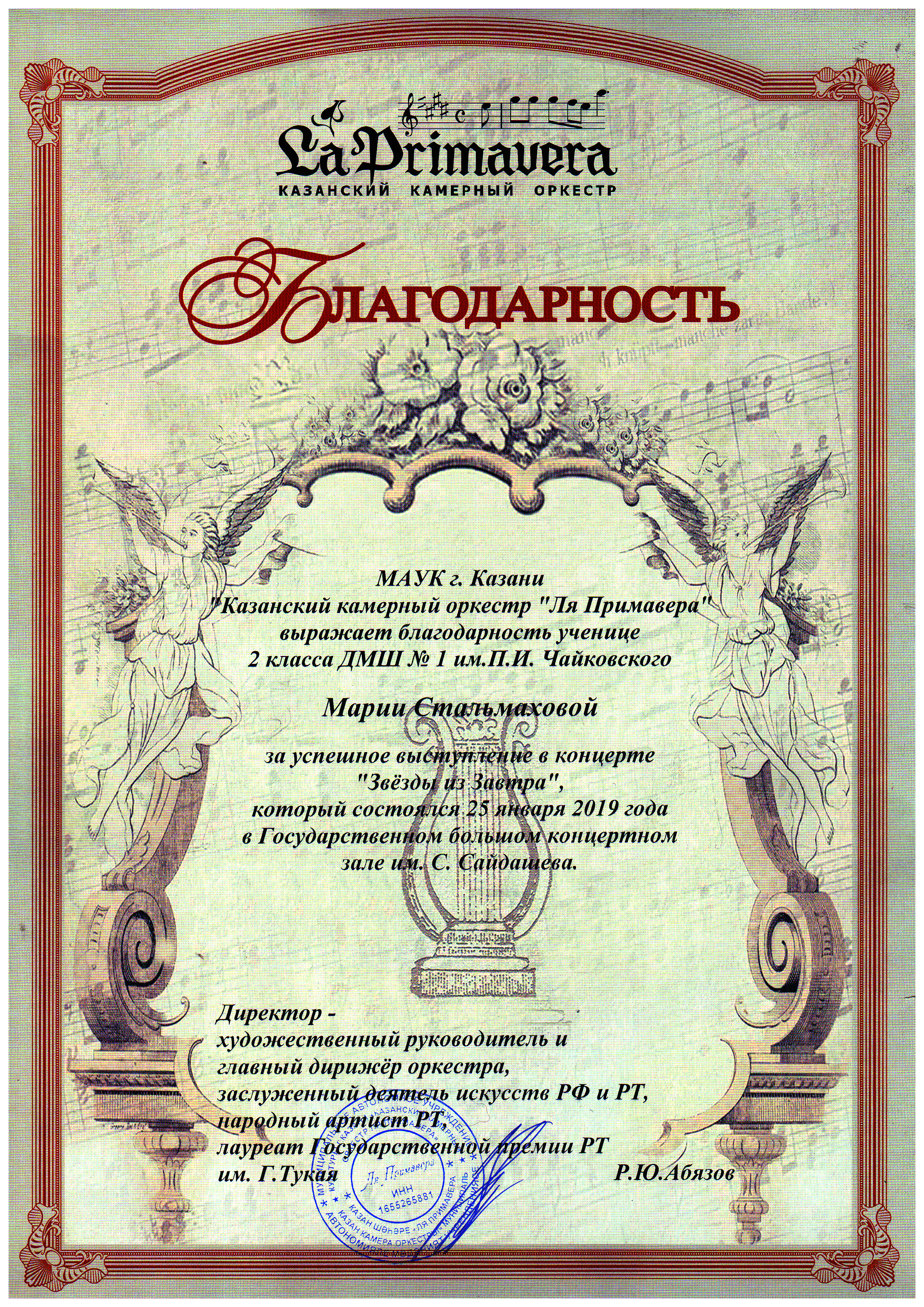 Концерт Казанского камерного оркестра "La Primavera" - Стальмахова Мария, Благодарность;