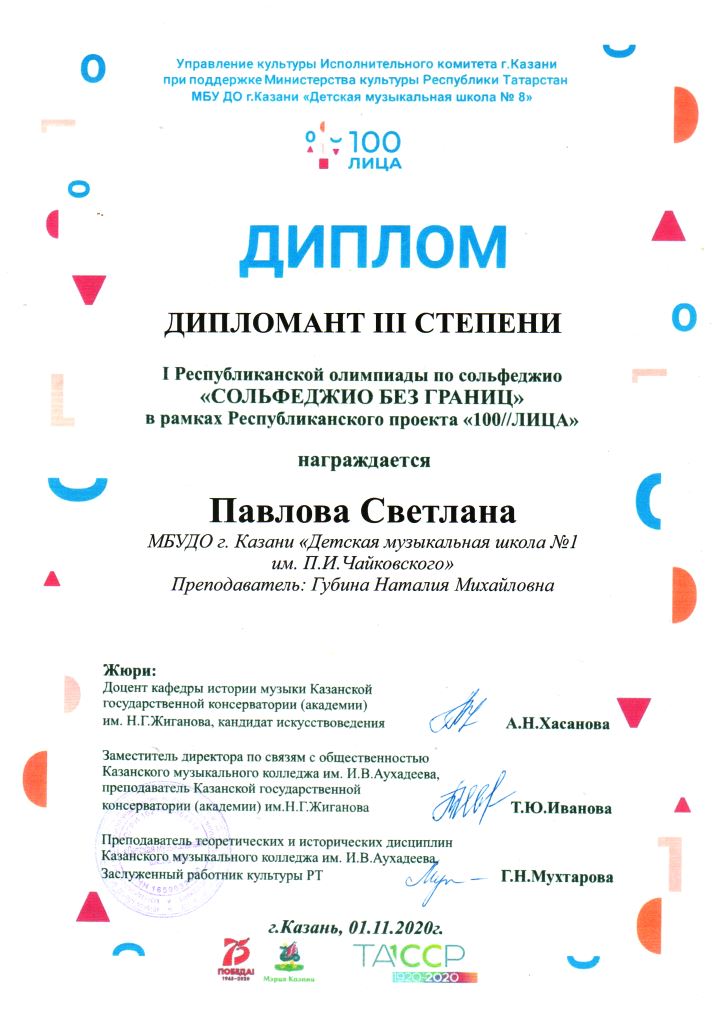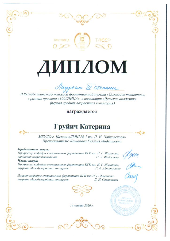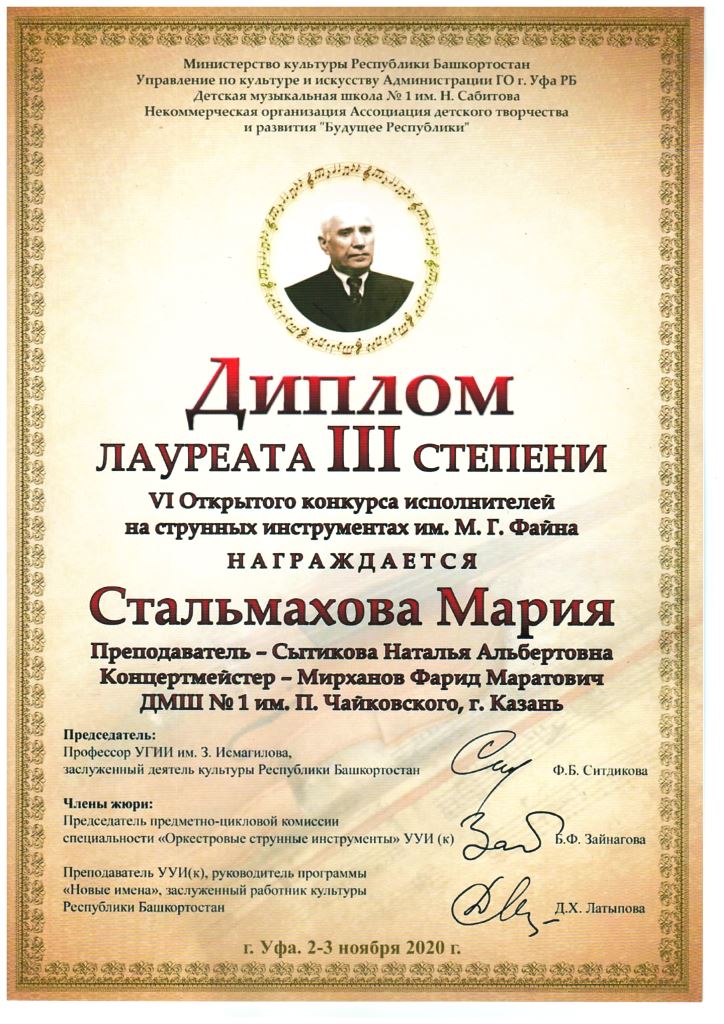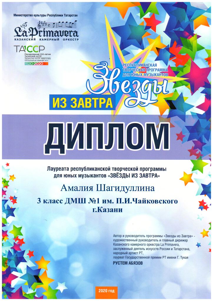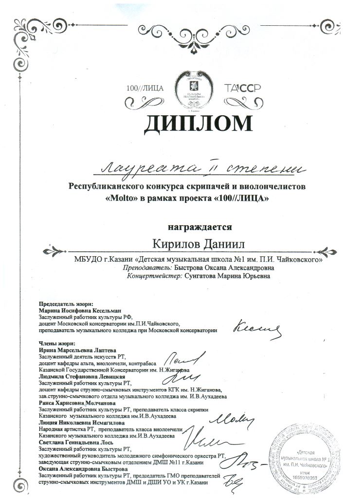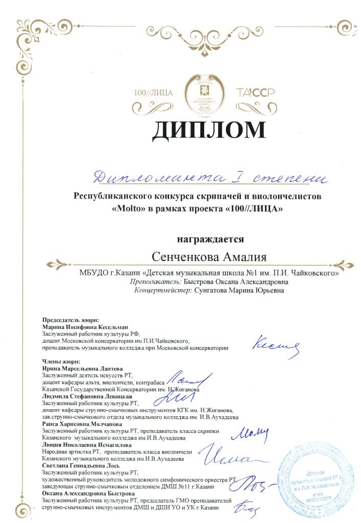 Республиканский конкурс скрипачей и виолончелистов "MOLTO" в рамках проекта "100/ЛИЦА" - Сенченкогва Амалия, Дипломант III степени, класс Быстровой О.А., концертмейстер Сунгатова М.Ю.;