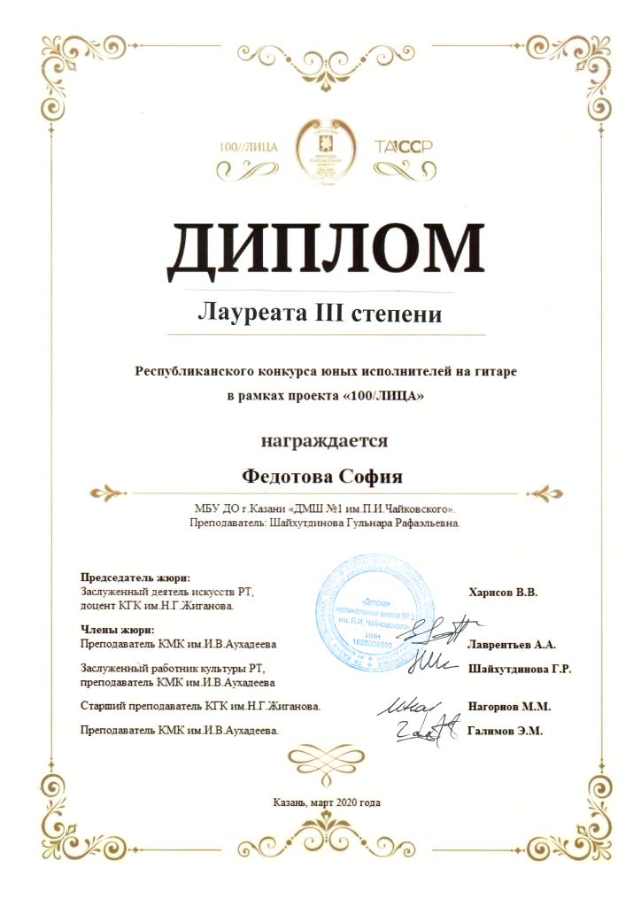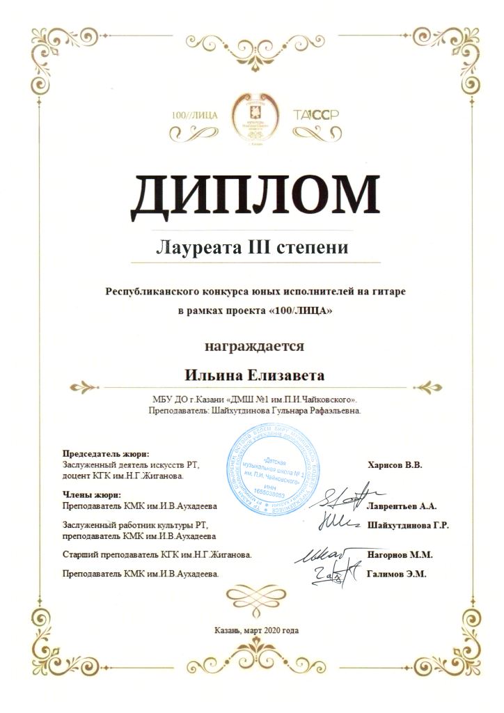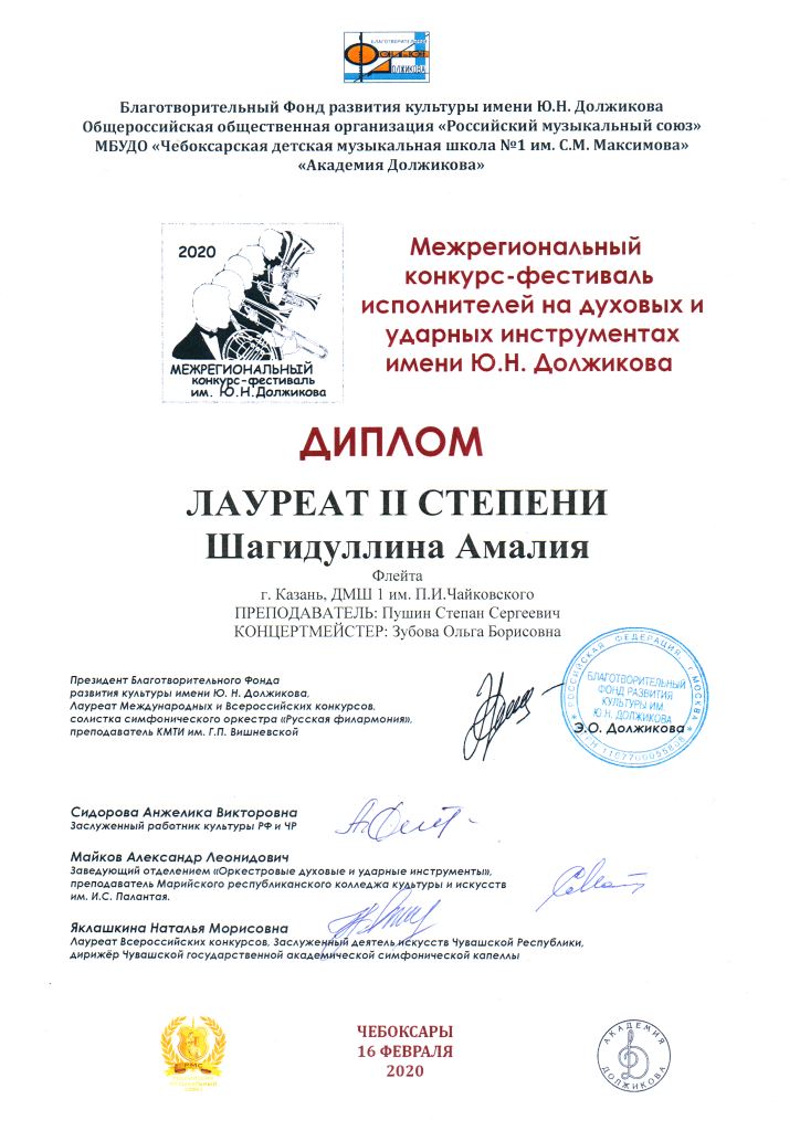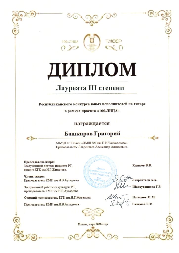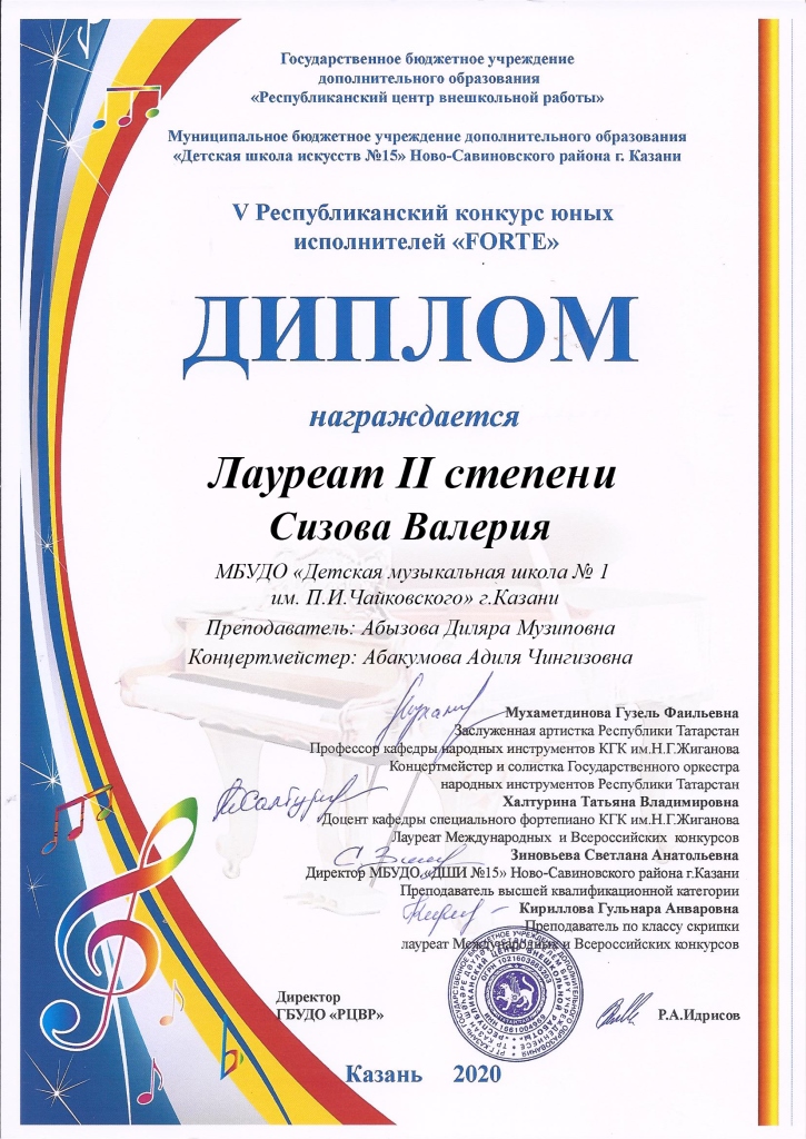 Республиканский конкурс скрипачей и виолончелистов "MOLTO" в рамках проекта "100/ЛИЦА" - Сенченкогва Амалия, Дипломант III степени, класс Быстровой О.А., концертмейстер Сунгатова М.Ю.;