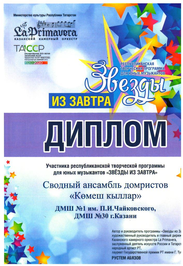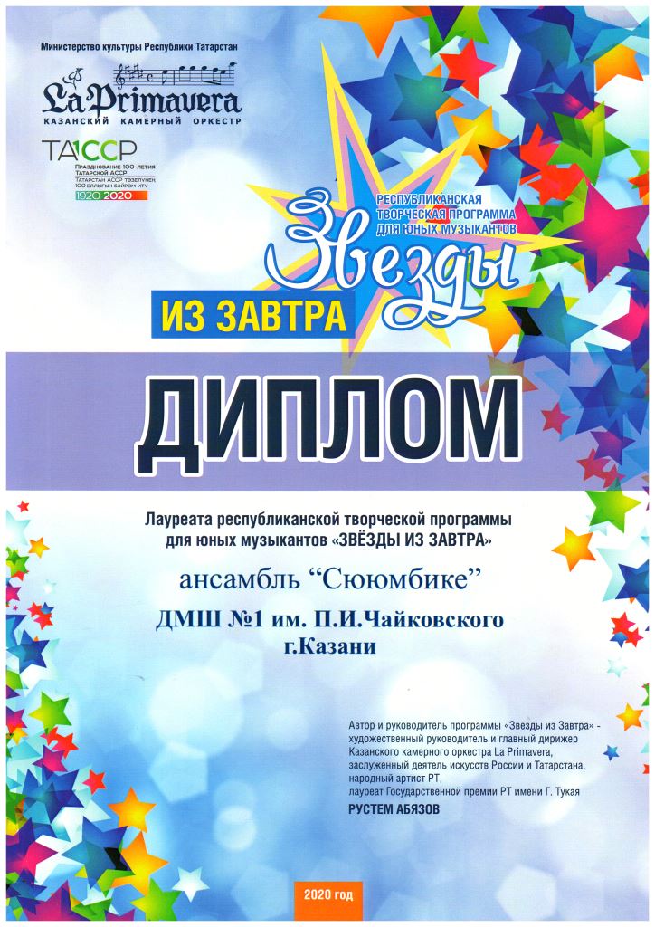 Республиканская творческая программа для юных музыкантов "Звёзды из завтра" - вокальный ансамбль"Сююмбике", Диплом лауреата, рук.Ахунова Г.М.;