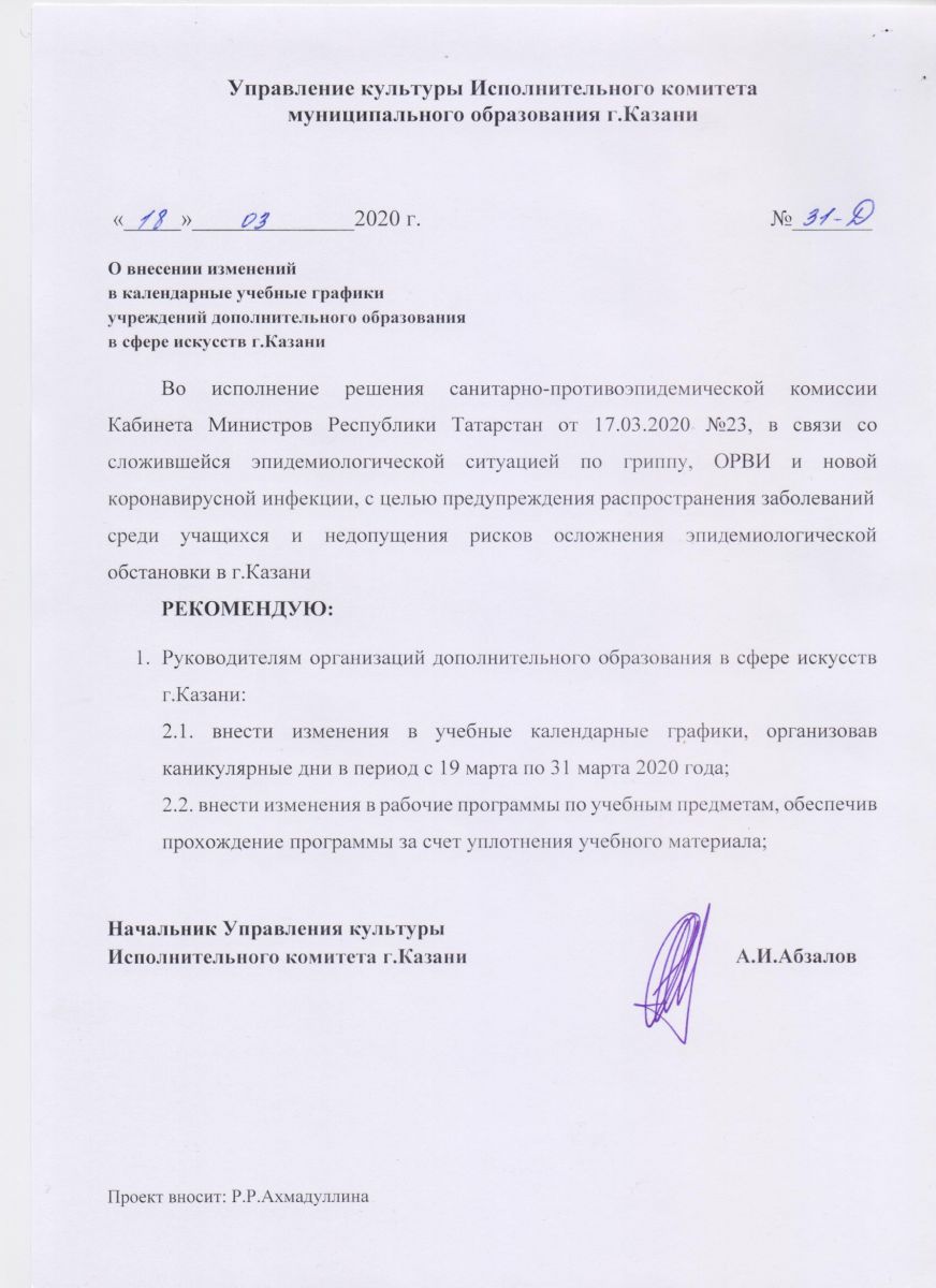 Приказ Управления культуры ИКМО г.Казани № 31-Д от 18.03.2020 г.;