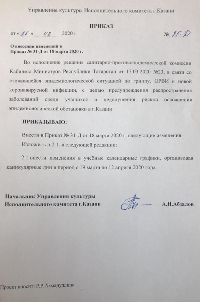 Приказ Управления культуры ИКМО г.Казани № 35-Д от 26.03.2020 г.;