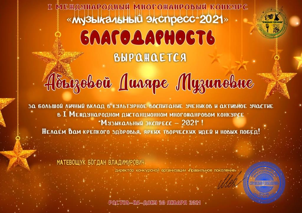 I Международный многожанровый конкурс "Музыкальный экспресс" - Благодарность Абызовой Д.М.;