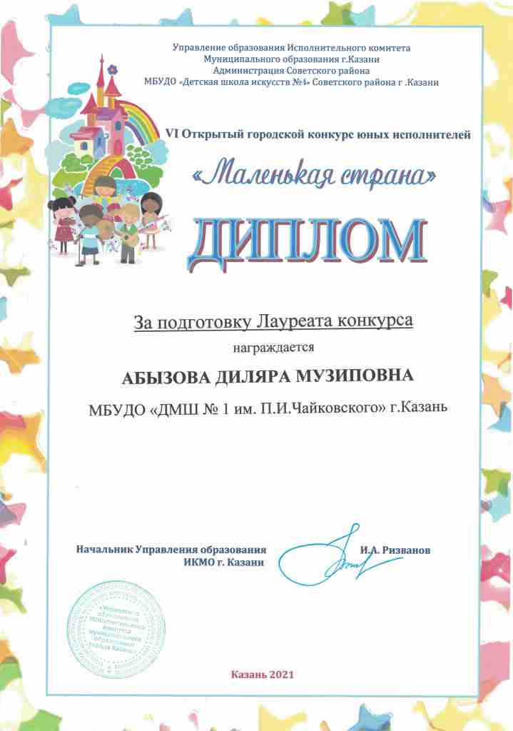 VI Открытый городской конкурс юных исполнителей "Маленькая страна" - Благодарность Абызовой Д.М.;