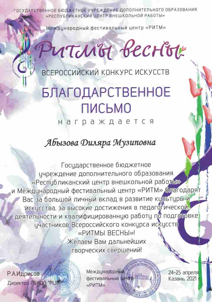 Всероссийский конкурс искусств "Ритмы весны" - Благодарность Абызовой Д.М.;