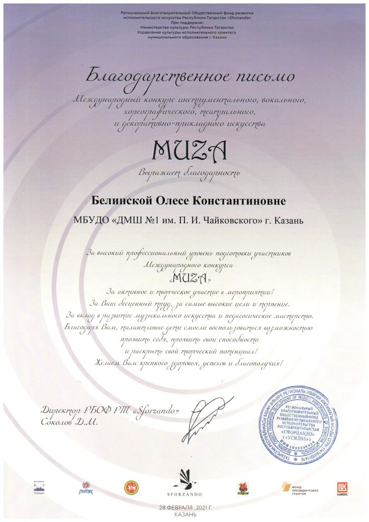 Международный конкурс инструментального искусства "Muza" - Благодарность Белинской О.К.;