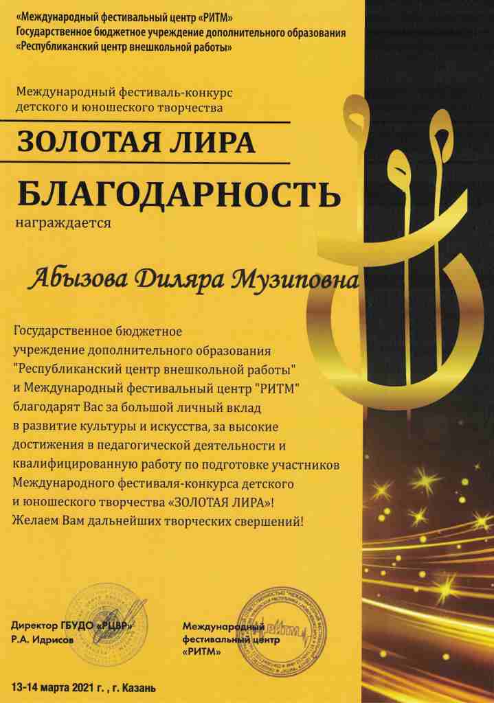 Международный фестиваль-конкурс "Дарование" - Благодарность Абызовой Д.М.;