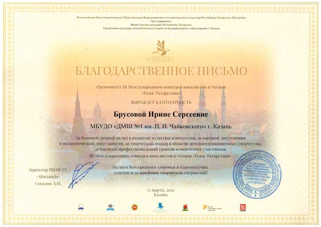 III Международный конкурс вокалистов и чтецов "Голос Татарстана" - Благодарность Брусовой И.С.;
