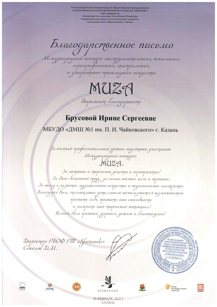 Международный конкурс инструментального искусства "Muza" - Благодарность Брусовой И.С.;