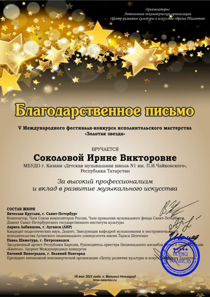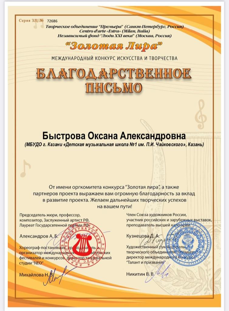 Международная олимпиада по сольфеджио "Vivo Solfeggio" - Благодарность Губиной Н.М.;