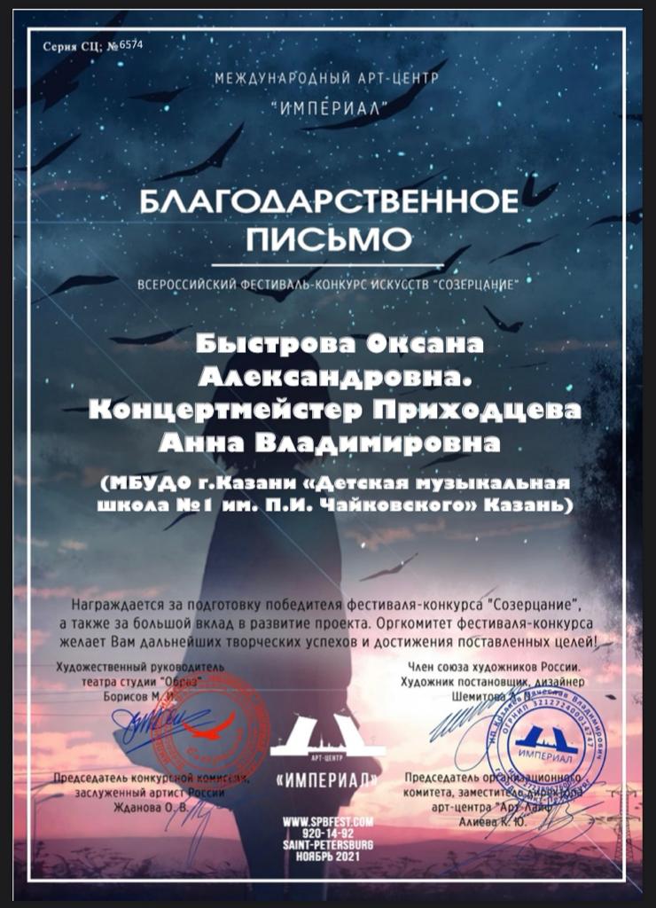 Всероссийский фестиваль-конкурс искусств "Созерцание" - Благодарственное письмо Быстровой О.А.;