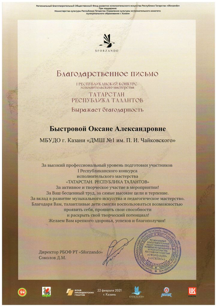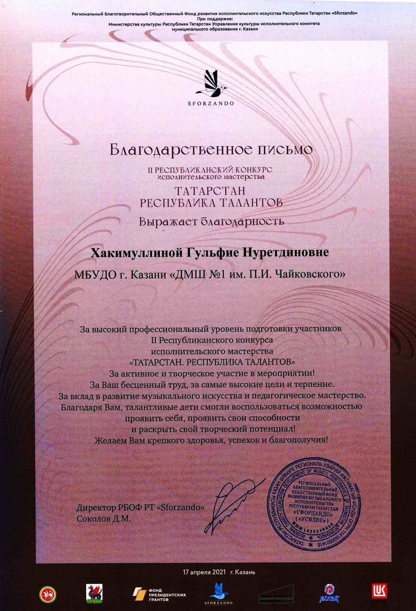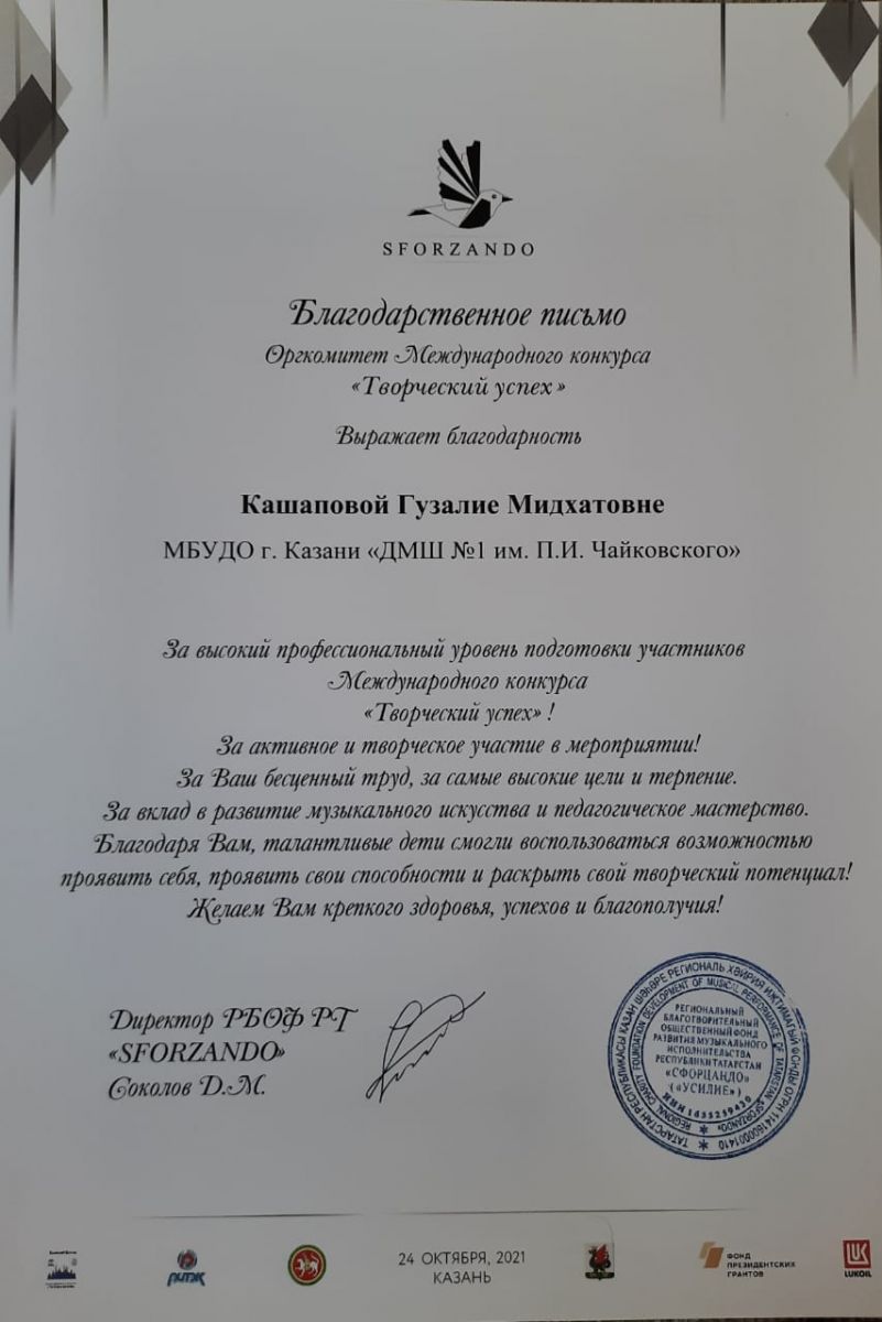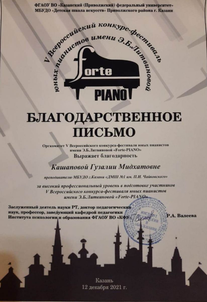 I Международный конкурс пианистов "PianoForte" - Благодарность Кашаповой Г.М.;