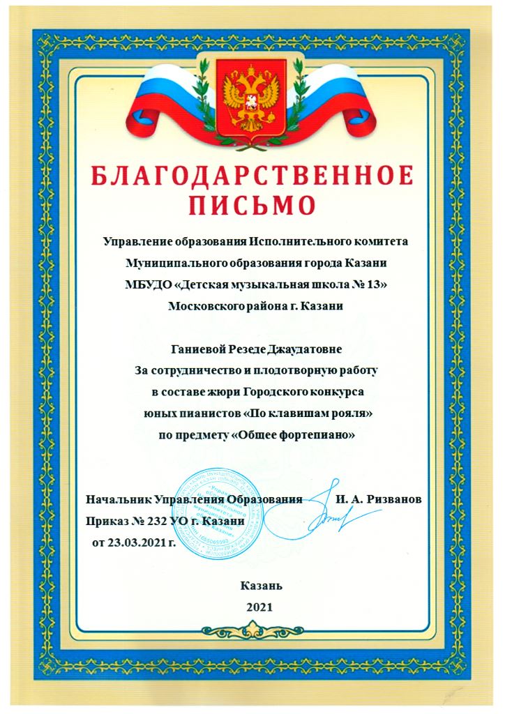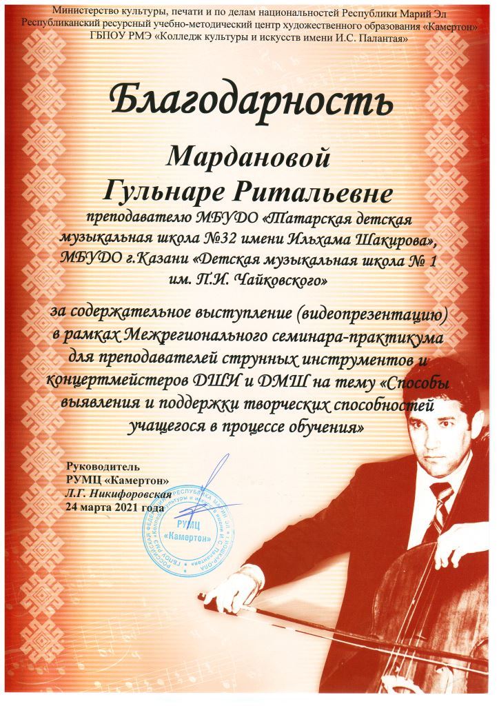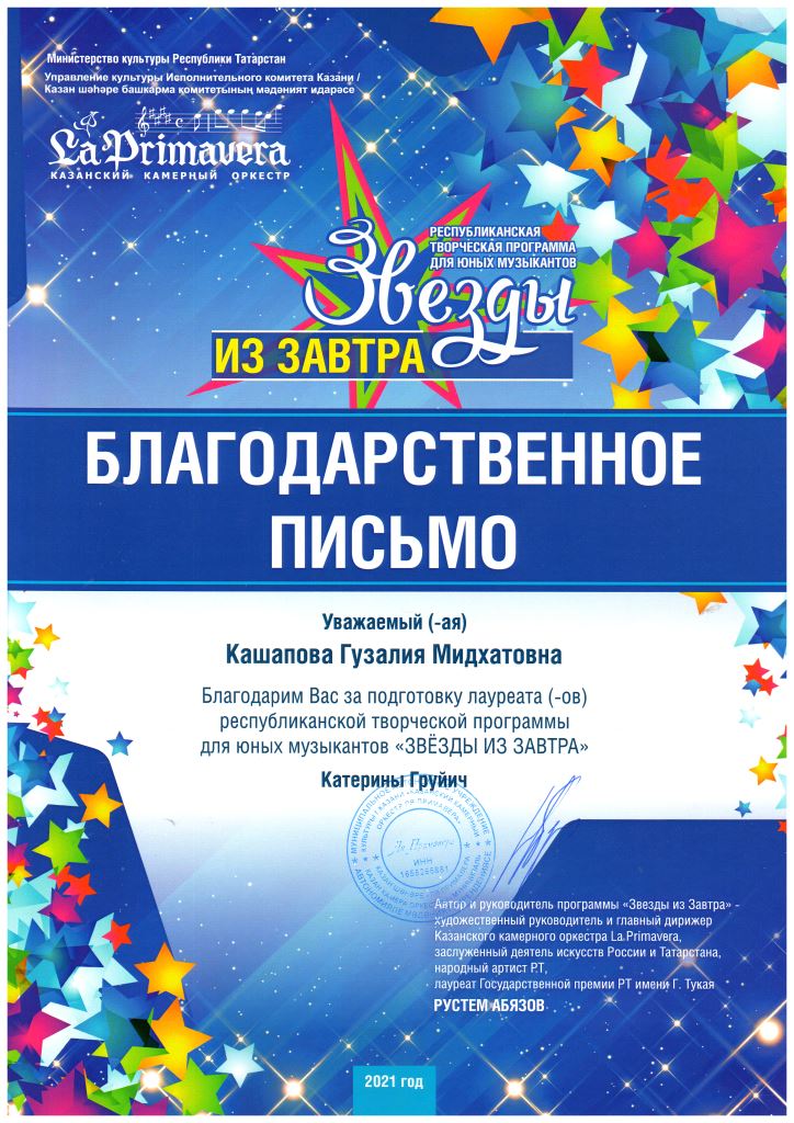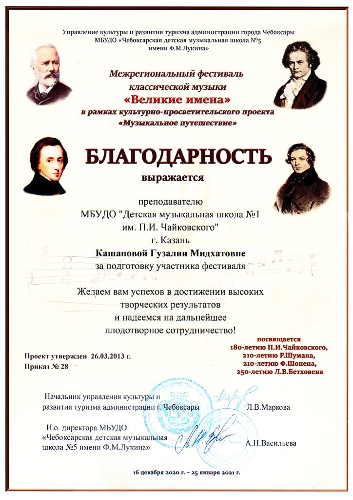 Межрегиональный фестиваль классической музыки "Великие имена" - Благодарность Кашаповой Г.М.;