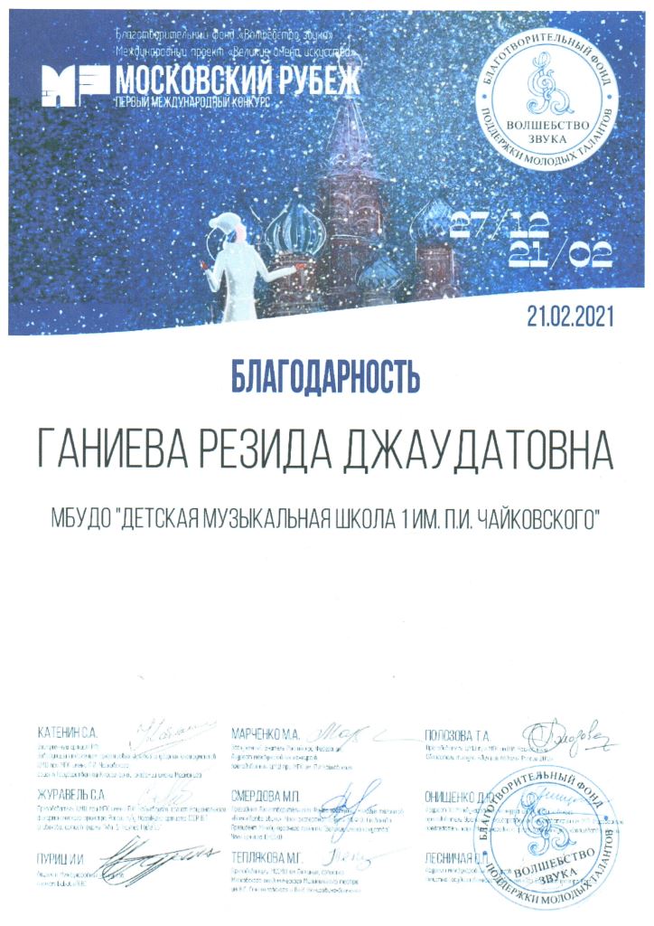Первый Международный конкурс "Московский рубеж" - Благодарность Ганиевой Р.Д.;