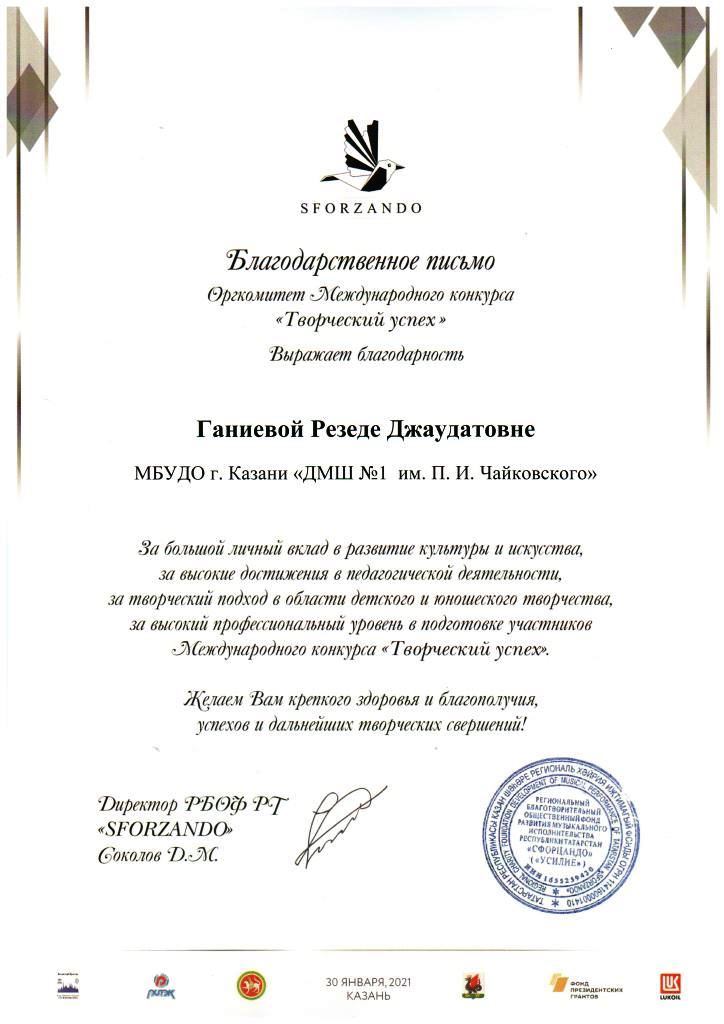 Международный конкурс "Творческий успех" - Благодарственное письмо Ганиевой Р.Д.;