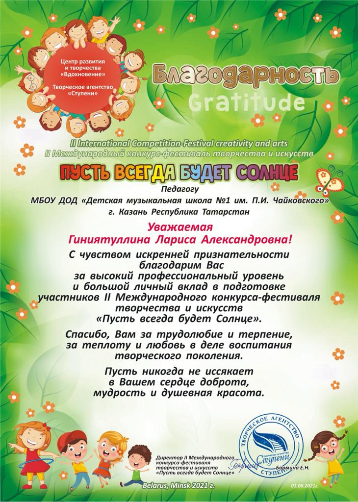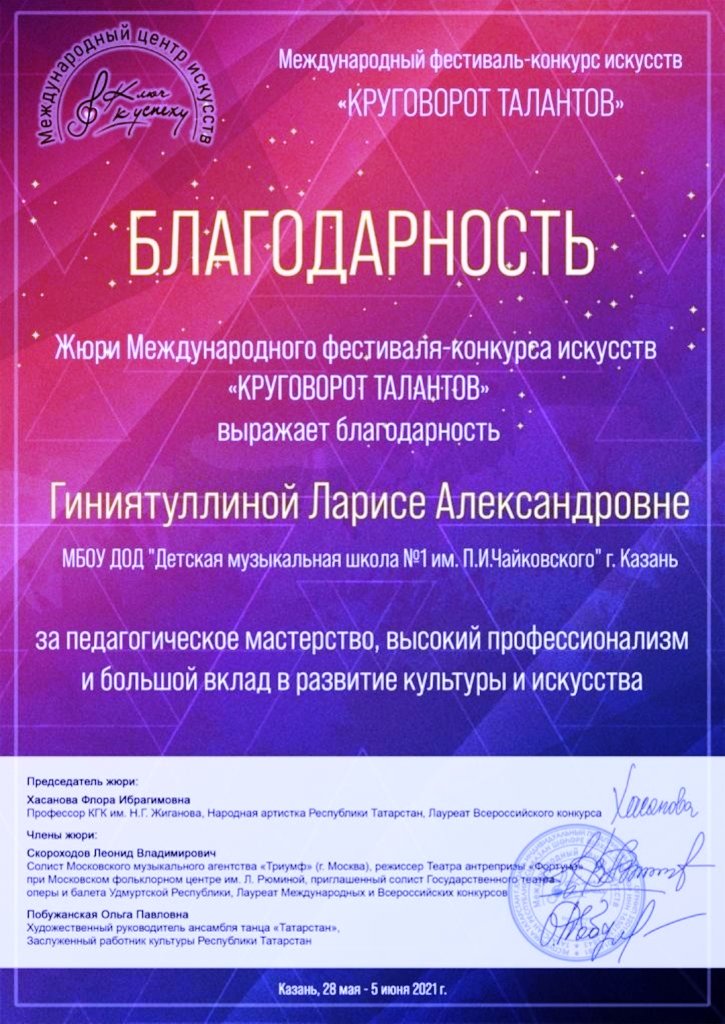 Международный фестиваль-конкурс искусств "Круговорот талантов" - Благодарность Гиниятуллиной Л.А.;