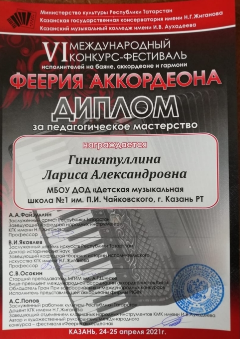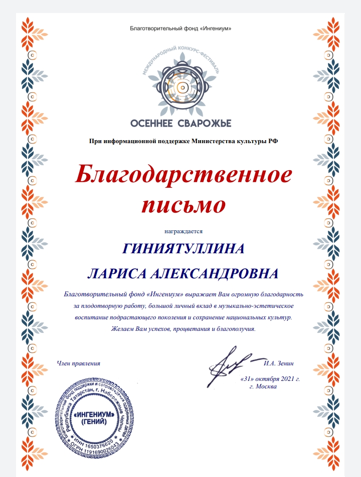 Международный конкурс-фестиваль "Осеннее Сварожье" - Благодарность Гиниятуллиной Л.А.;