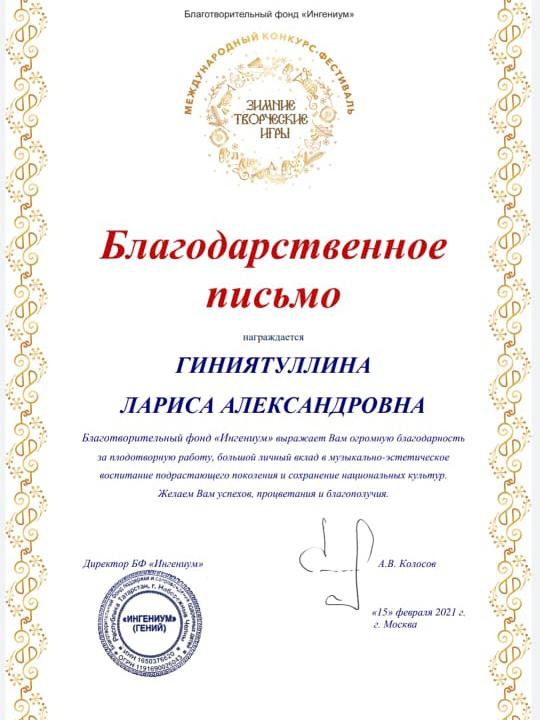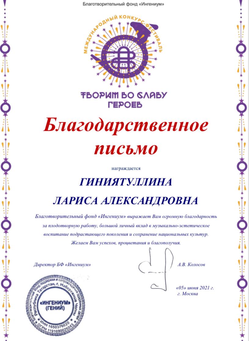 Международный конкурс-фестиваль "Творим во славу героев" - Благодарность Гиниятуллиной Л.А.;