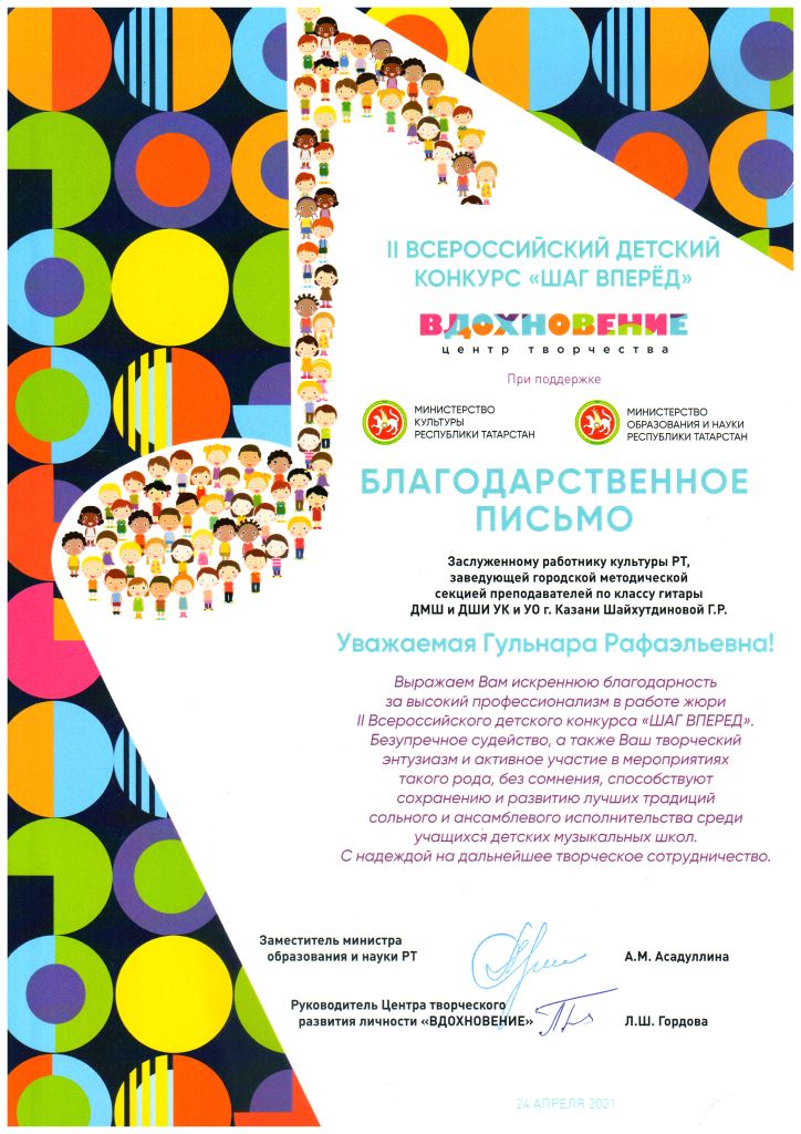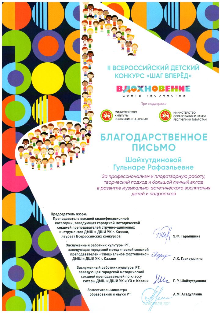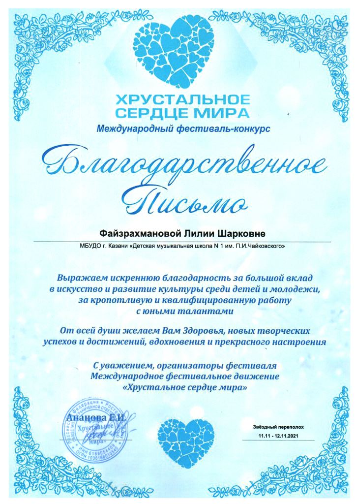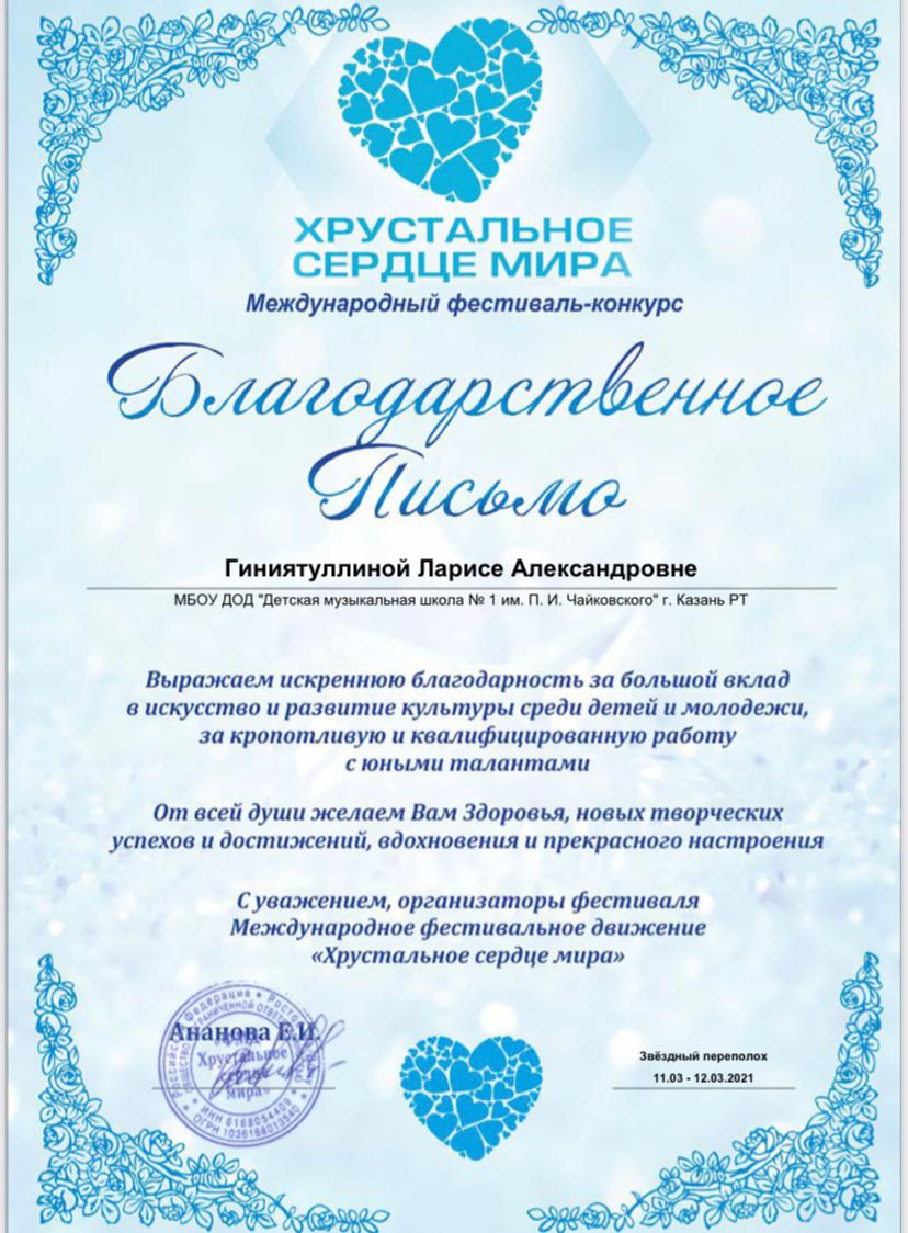 Международный фестиваль-конкурс "Хрустальное сердце мира" - Благодарность Гиниятуллиной Л.А.;