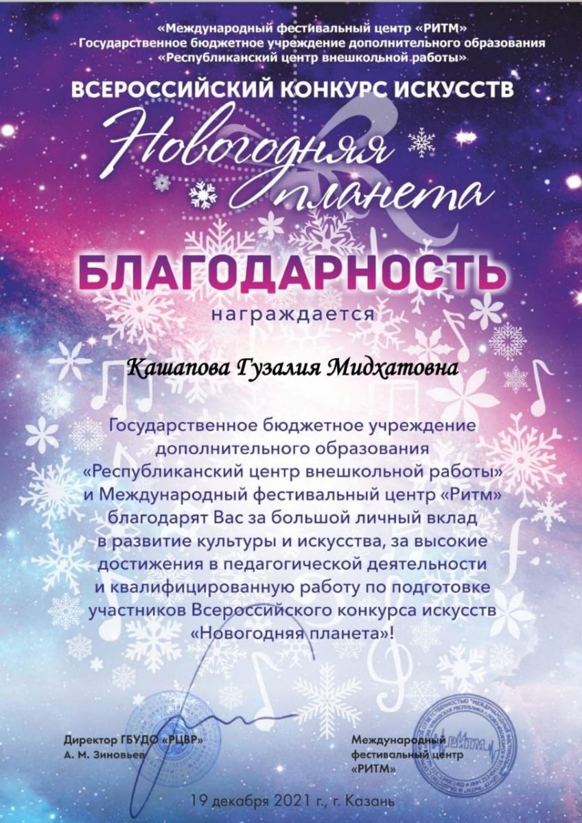 Всероссийский конкурс искусств "Новогодняя планета" - Благодарность Кашаповой Г.М.;