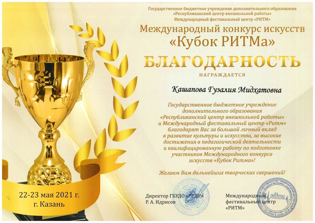 Международный конкурс искусств "Кубок РИТМа" - Благодарность Кашаповой Г.М.;